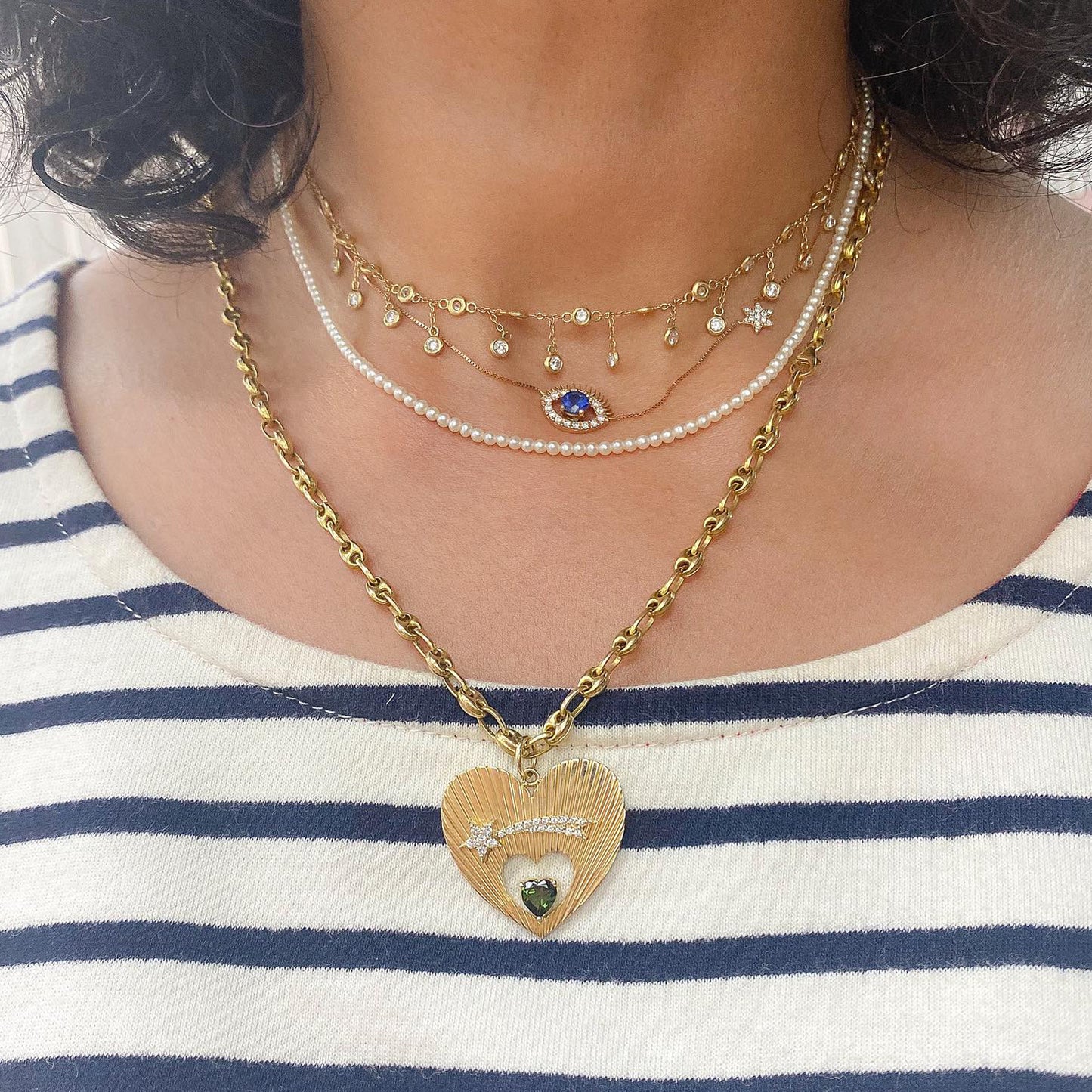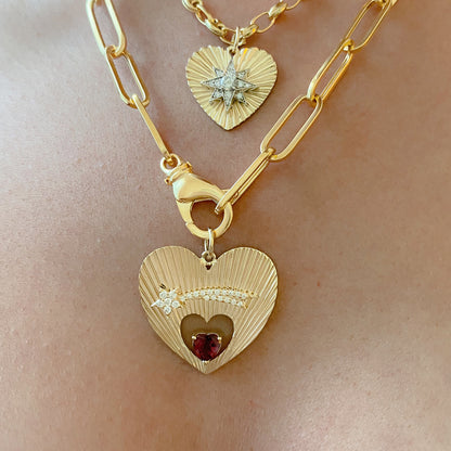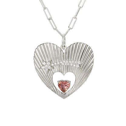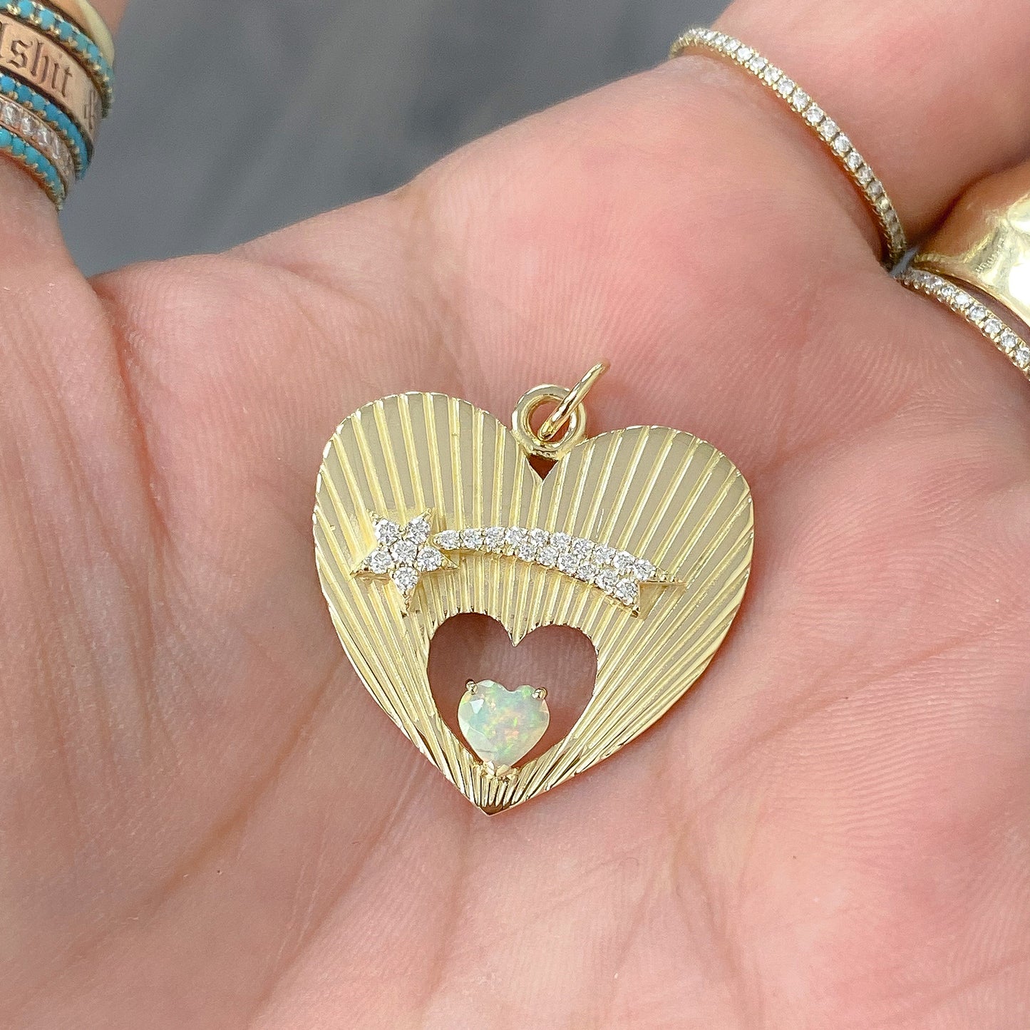 14K Gold Pavé Diamond Shooting Star Fluted Heart Medallion Necklace With Solitaire Tourmaline