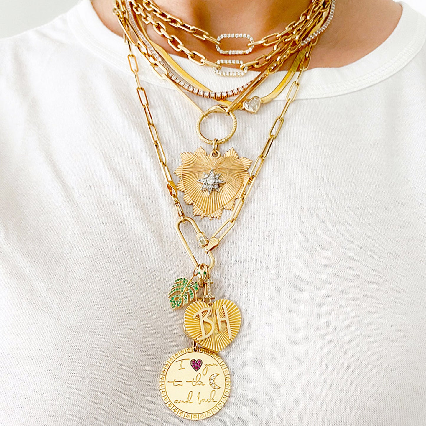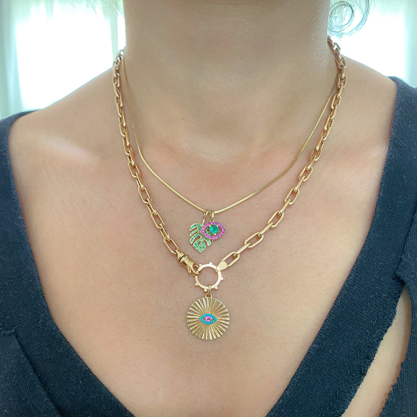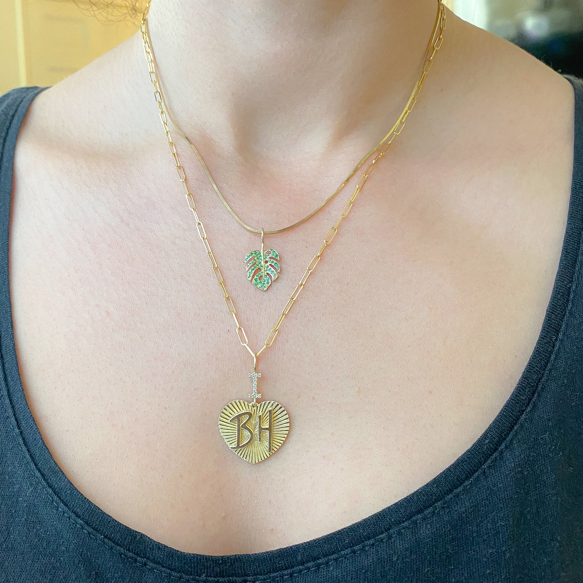 This unique little tropical palm leaf pendant is composed of 14K solid gold and beautifully complemented with hand pavé set AAA quality genuine Emerald gemstones. The pendant is available to be purchased with a durable 14K solid gold snake chain, finished with a secure spring ring clasp and Nana Bijou signature logo tag. This design is also available to be purchased as a charm alone without the chain.