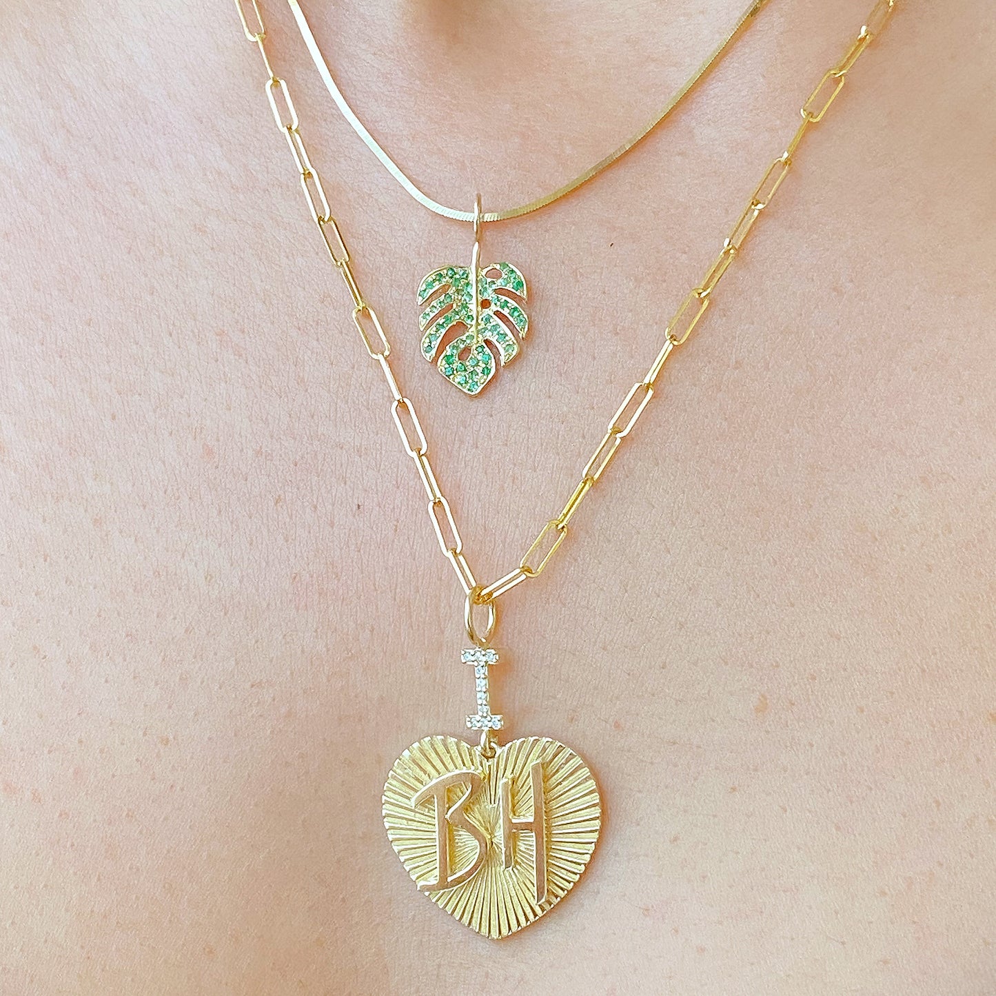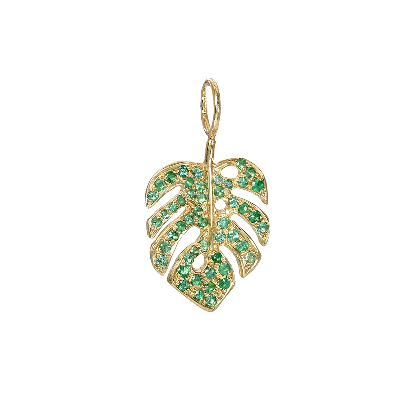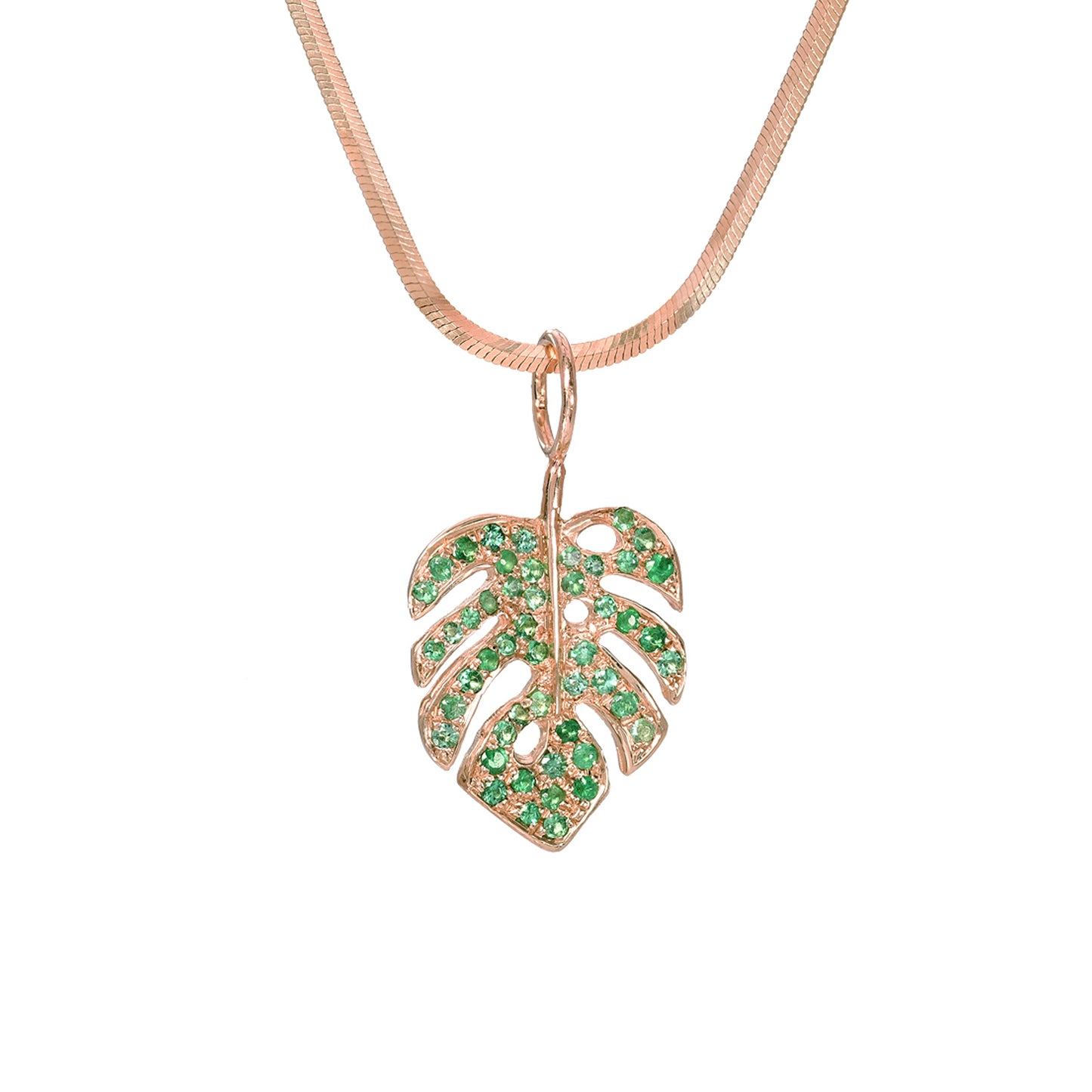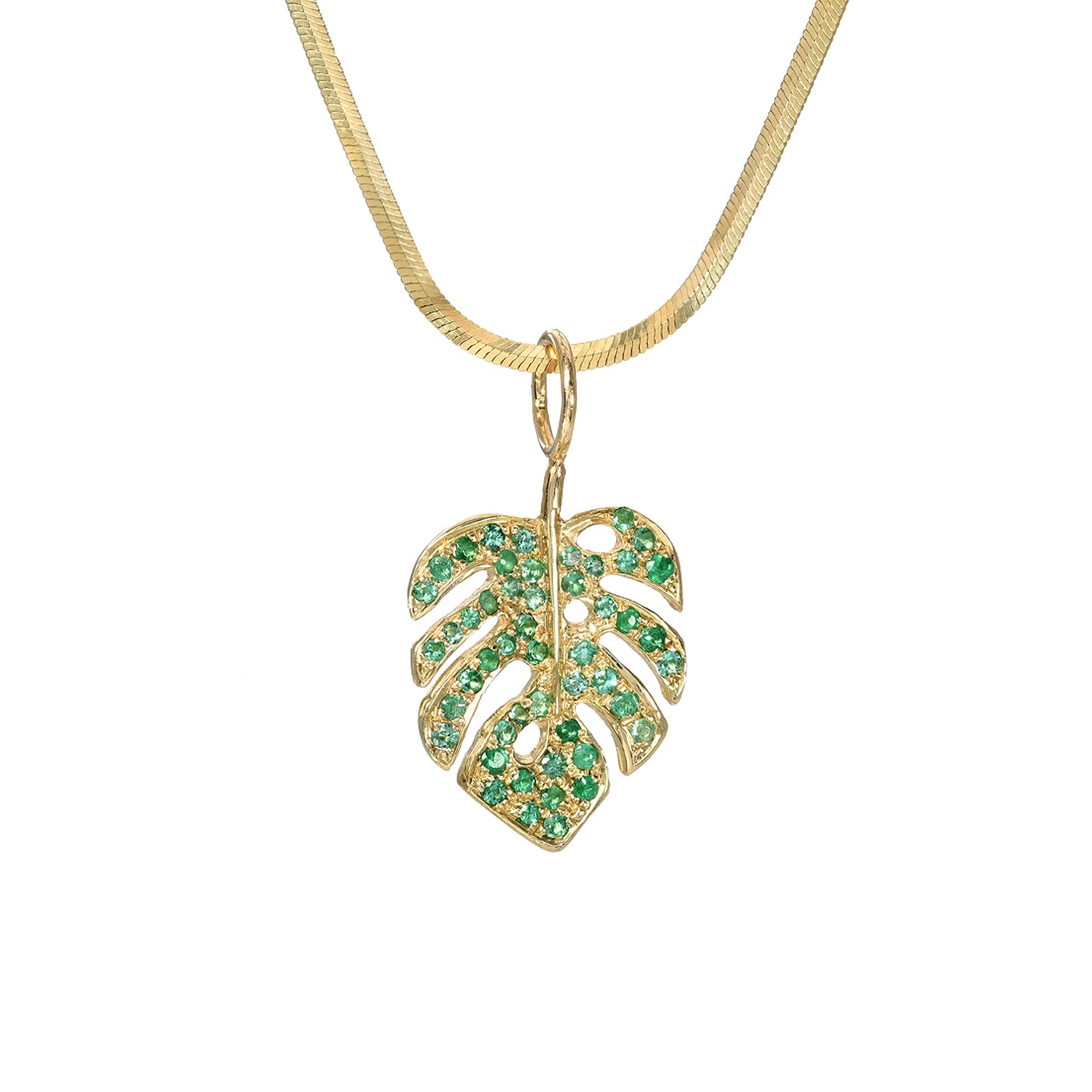 14K Gold Pavé Emerald Monstera Palm Leaf Charm Necklace