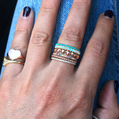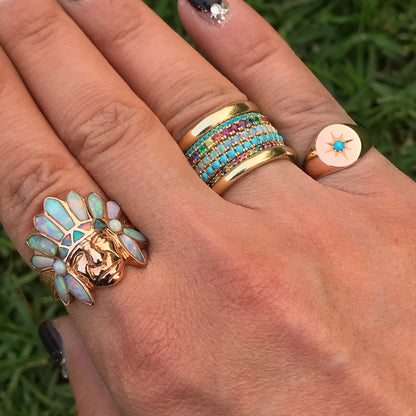 This finely handcrafted ring is made completely of 14K solid gold and pavé set with genuine AAA quality round cabochon cut natural real Opal gemstones.