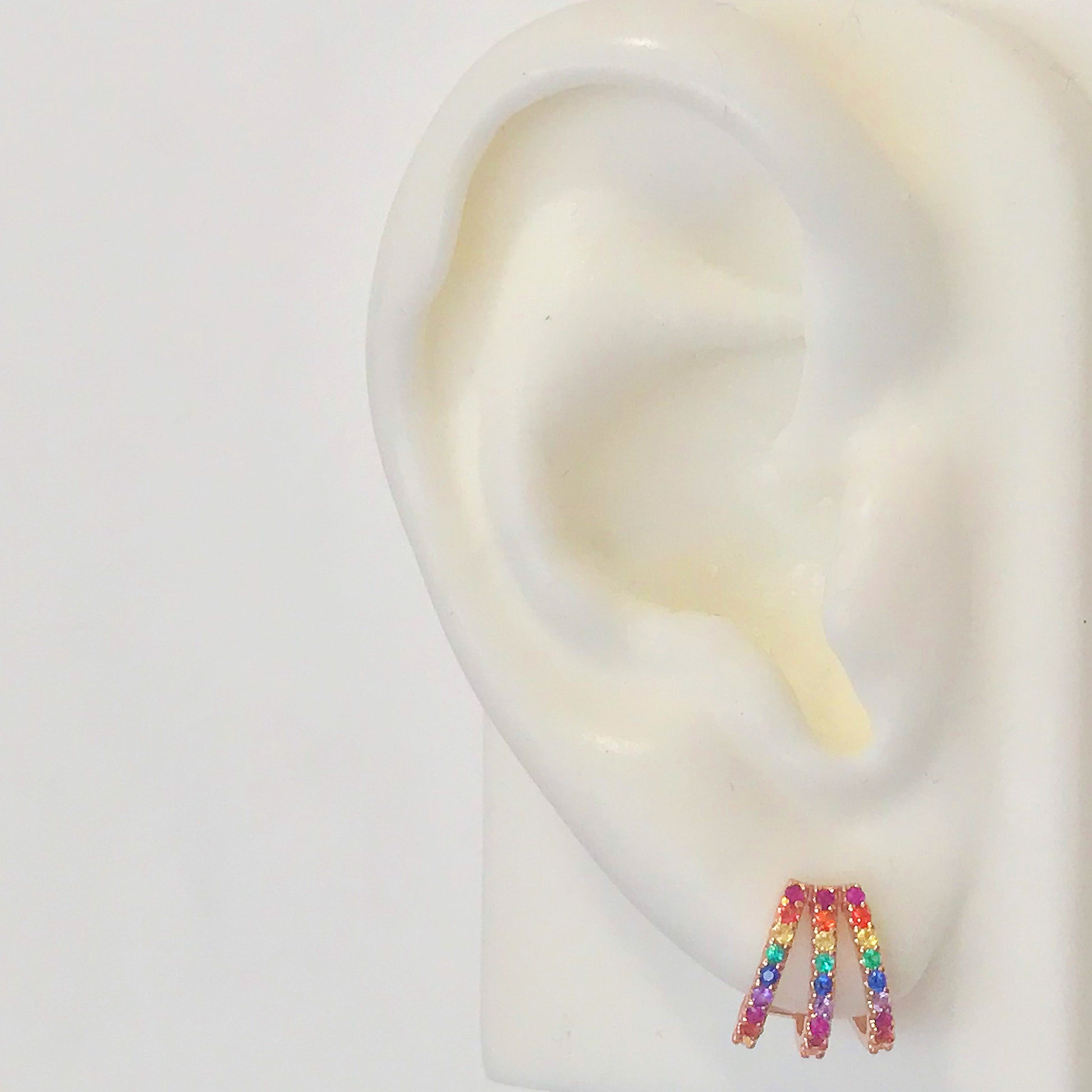 14K Gold Pavé Rainbow Gemstone 3 Row Hoop Stud Earrings
