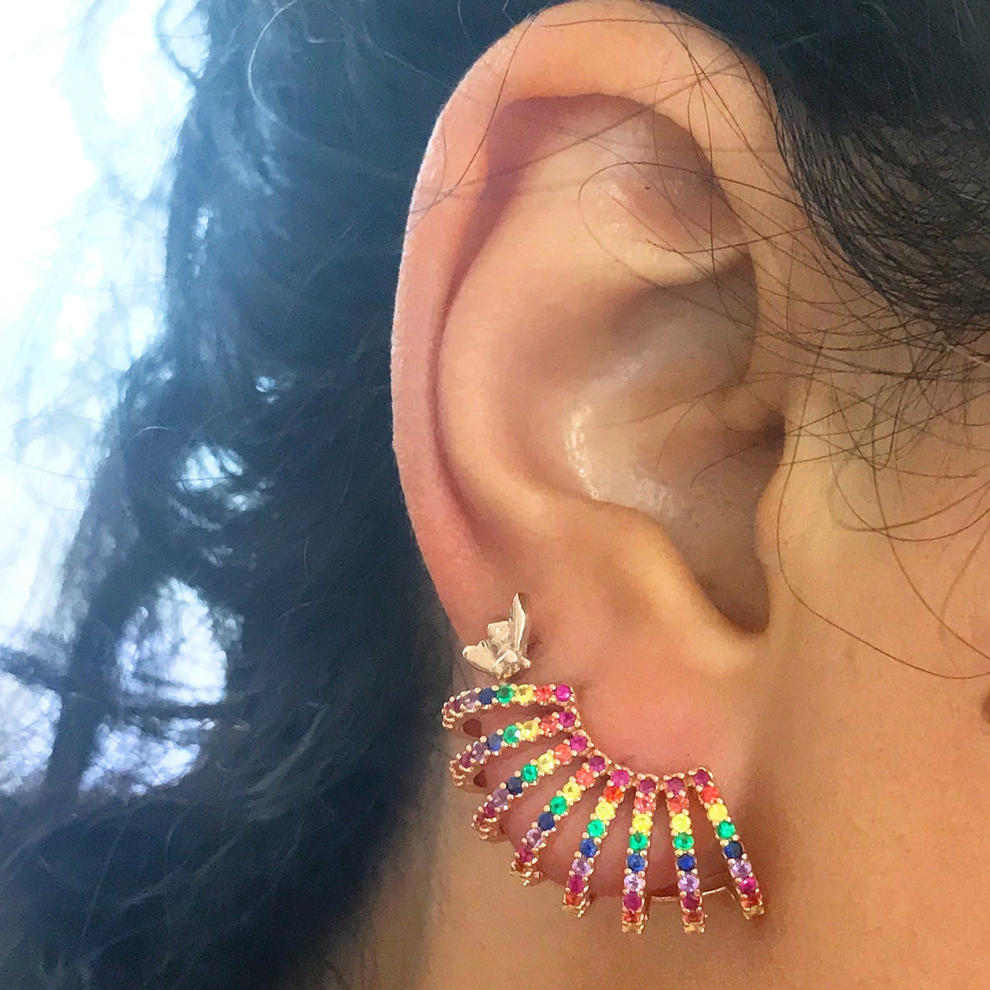 This finely handcrafted 8 row huggie hoop style stud earring is composed of 14K solid gold and pavé set with AAA quality round brilliant cut natural real Rubies, Orange Sapphires, Yellow Sapphires, Blue Sapphires, Purple Sapphires & Emerald gemstones.