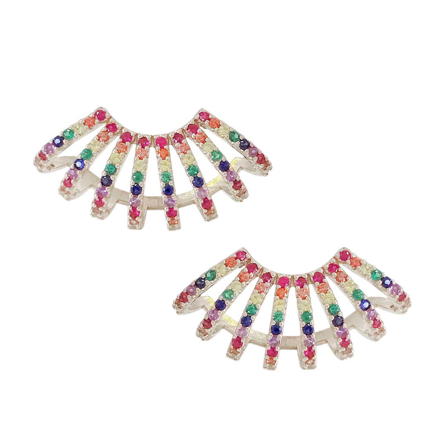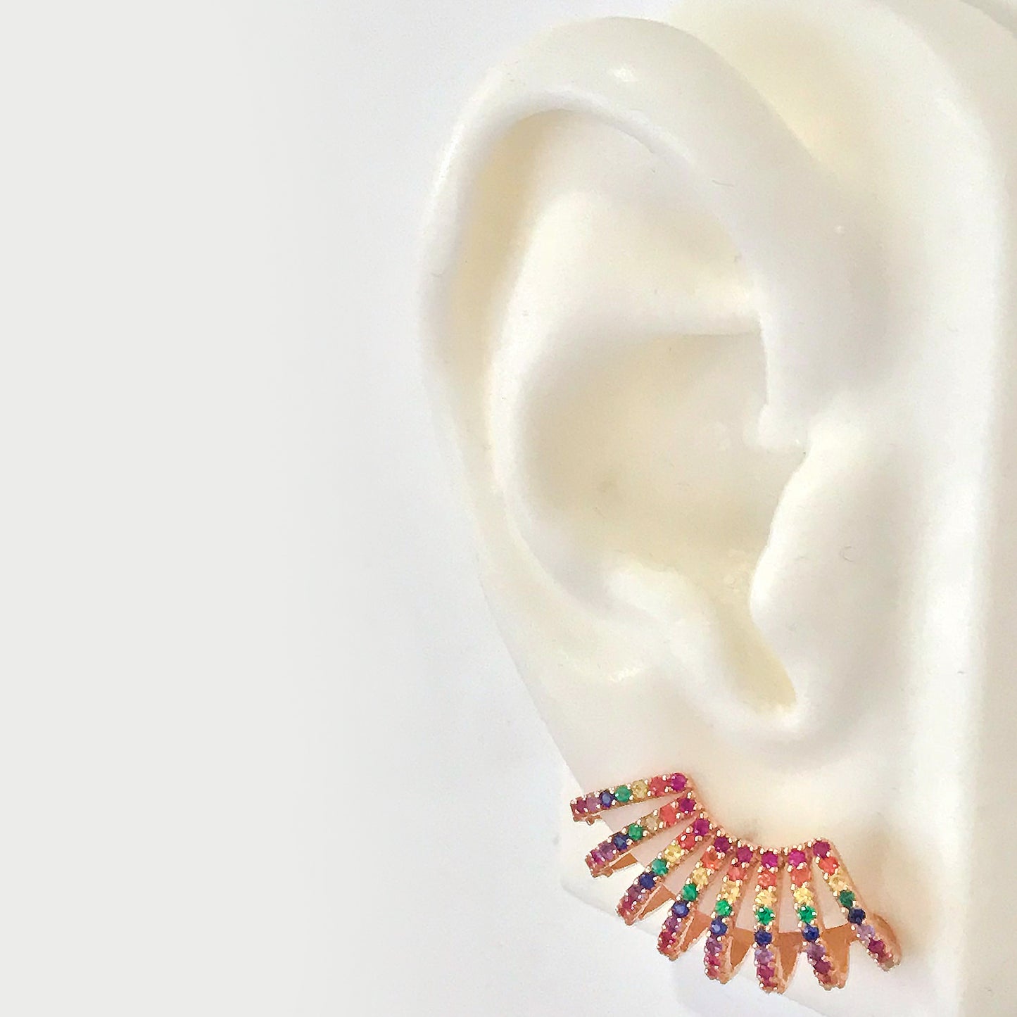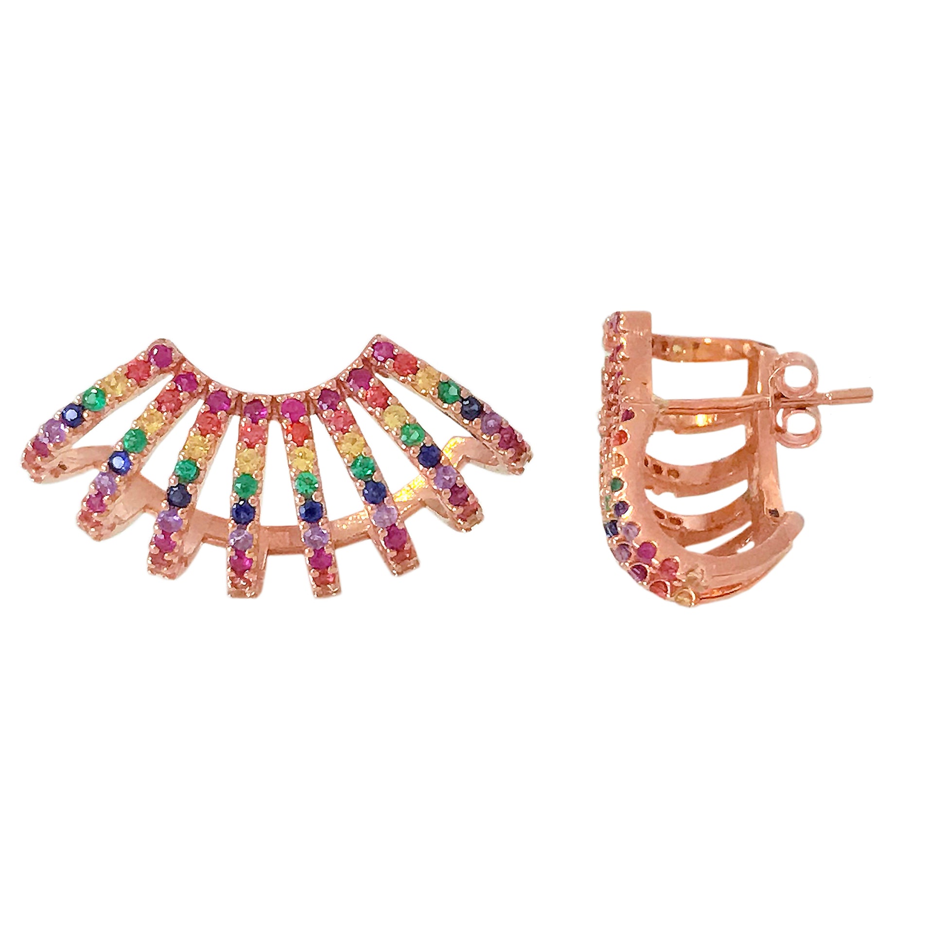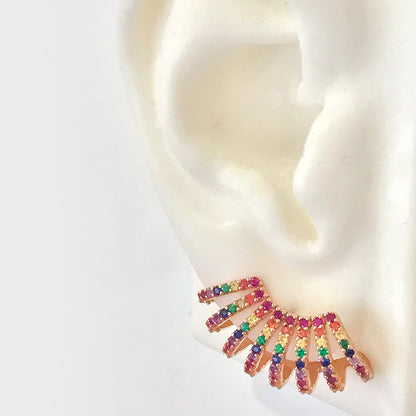 14K Gold Pavé Rainbow Gemstone 8 Row Hoop Stud Earrings