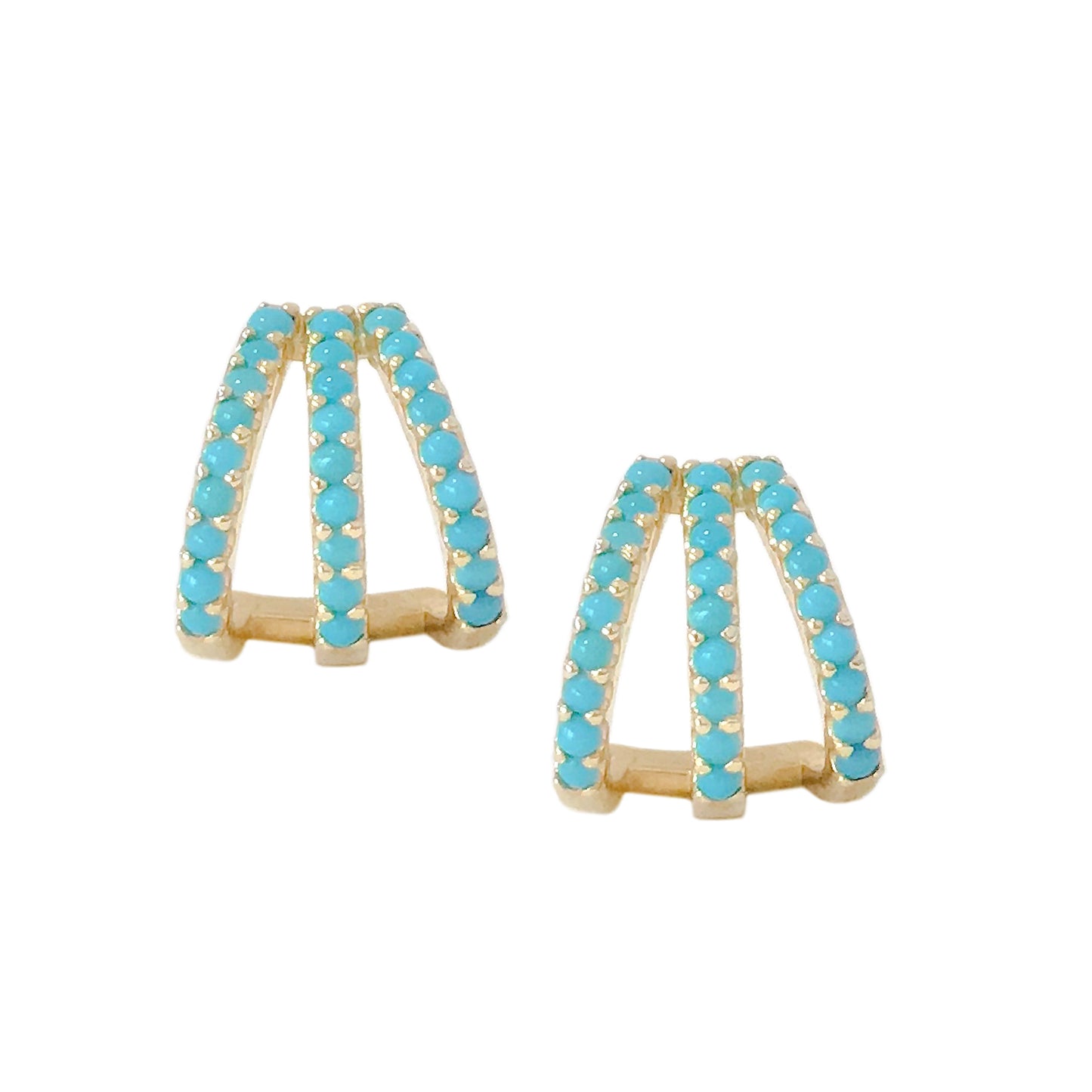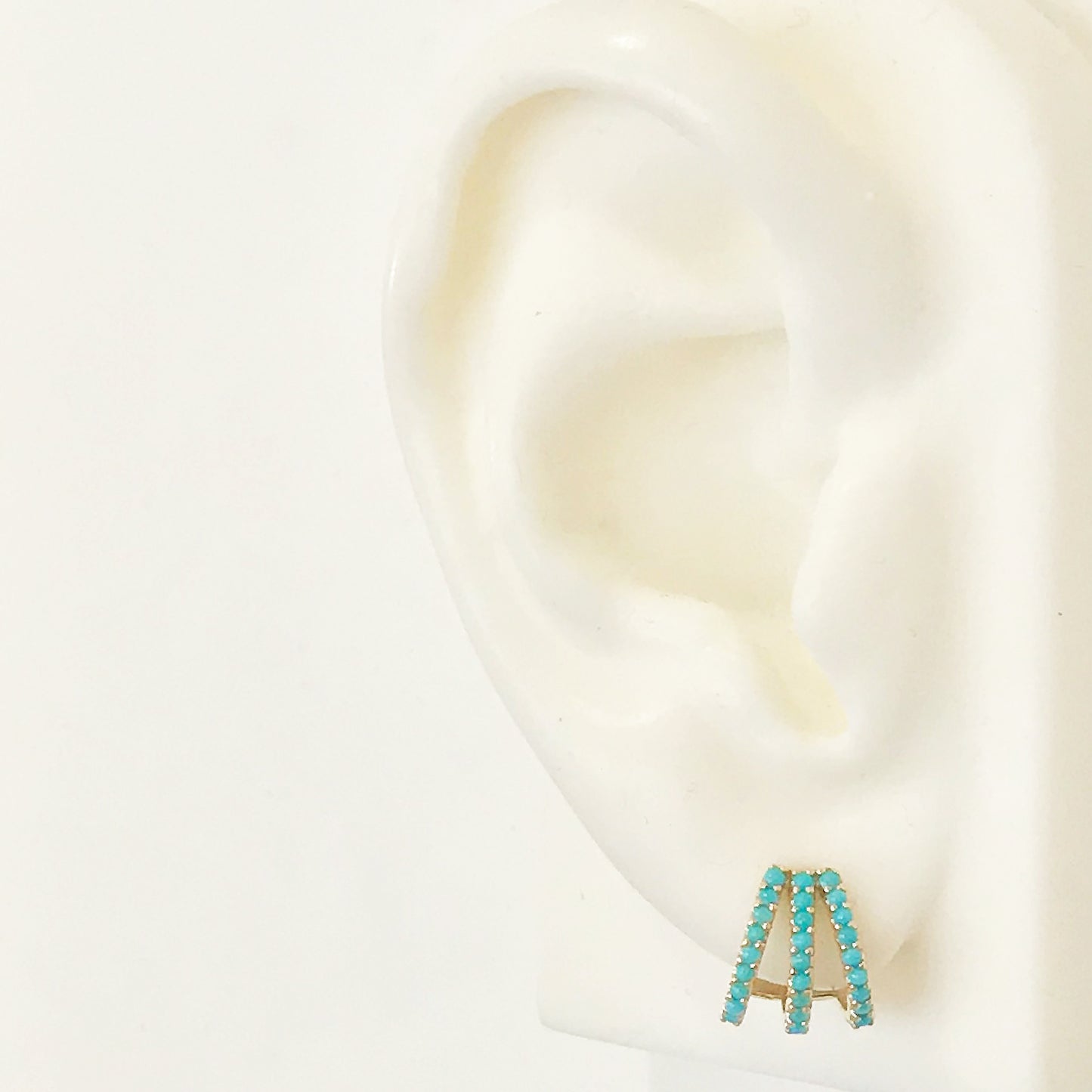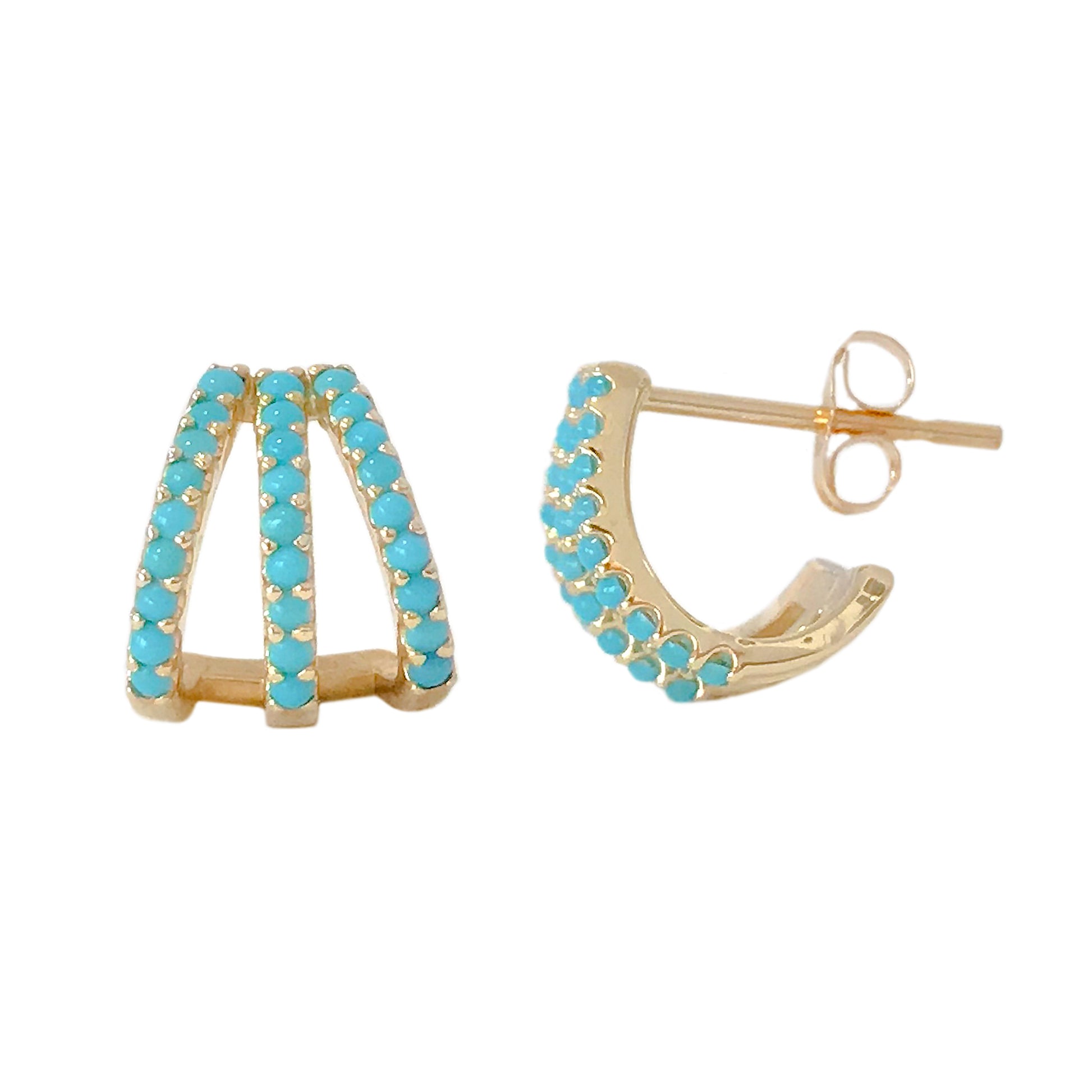 14K Gold Pavé Turquoise Gemstone 3 Row Hoop Stud Earrings