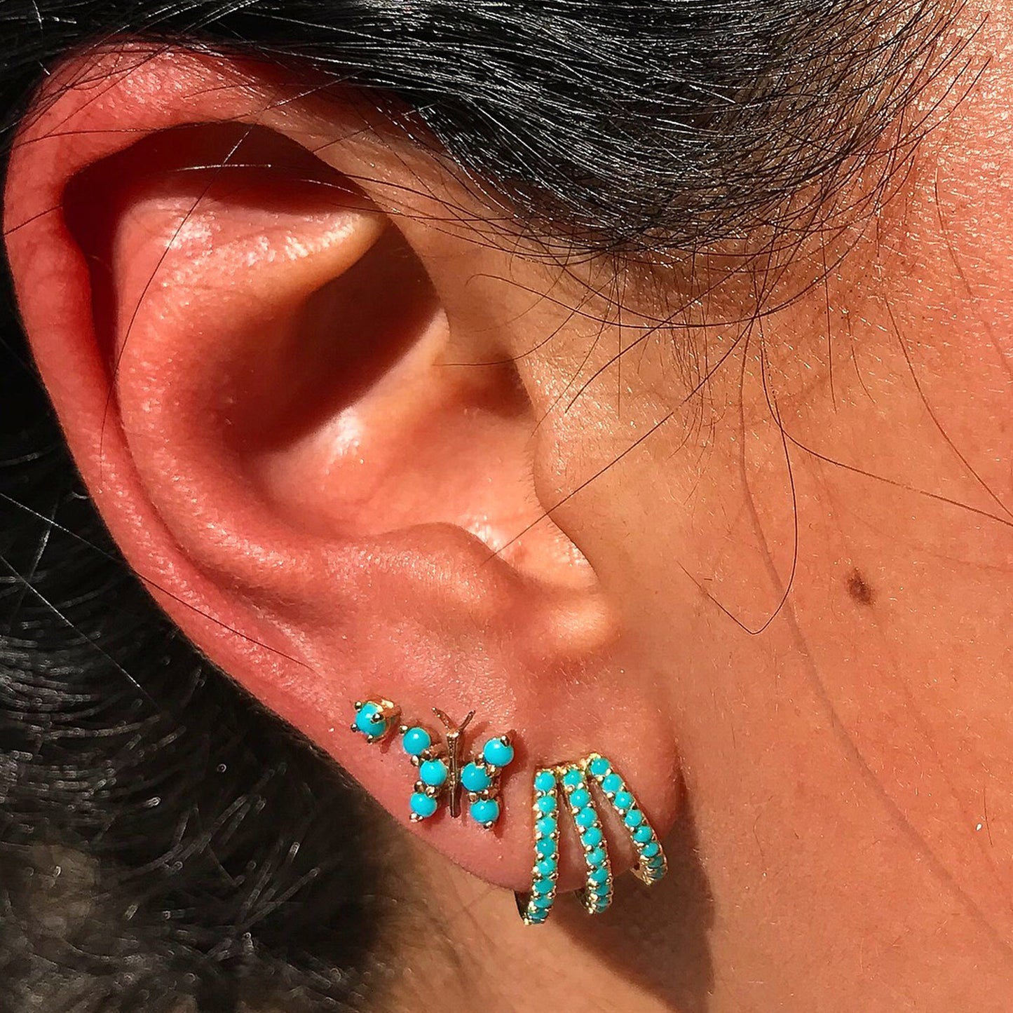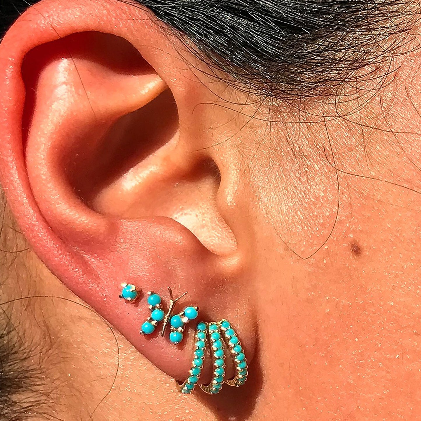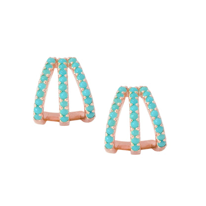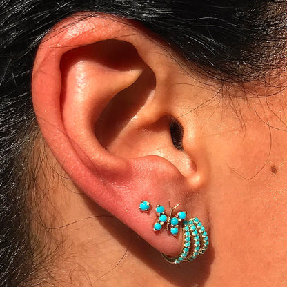 14K Gold Pavé Turquoise Gemstone 3 Row Hoop Stud Earrings
