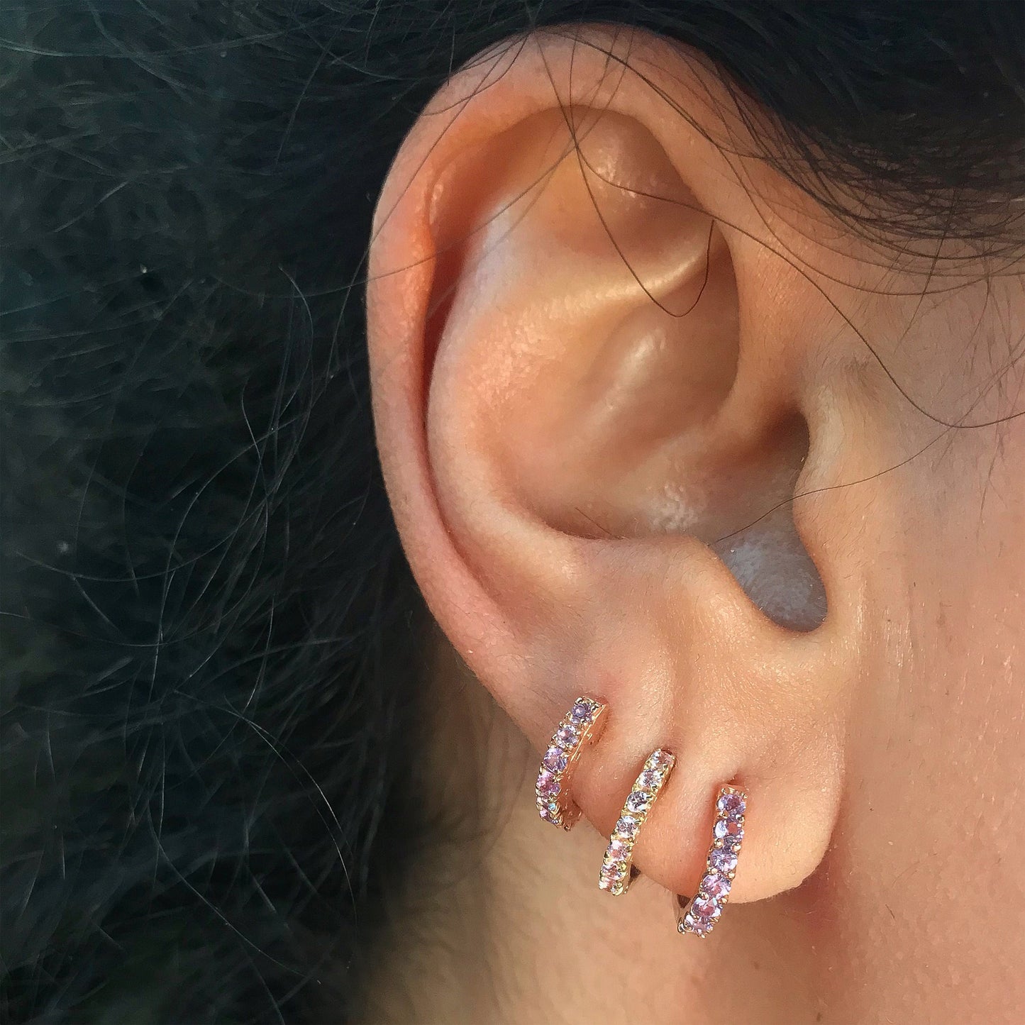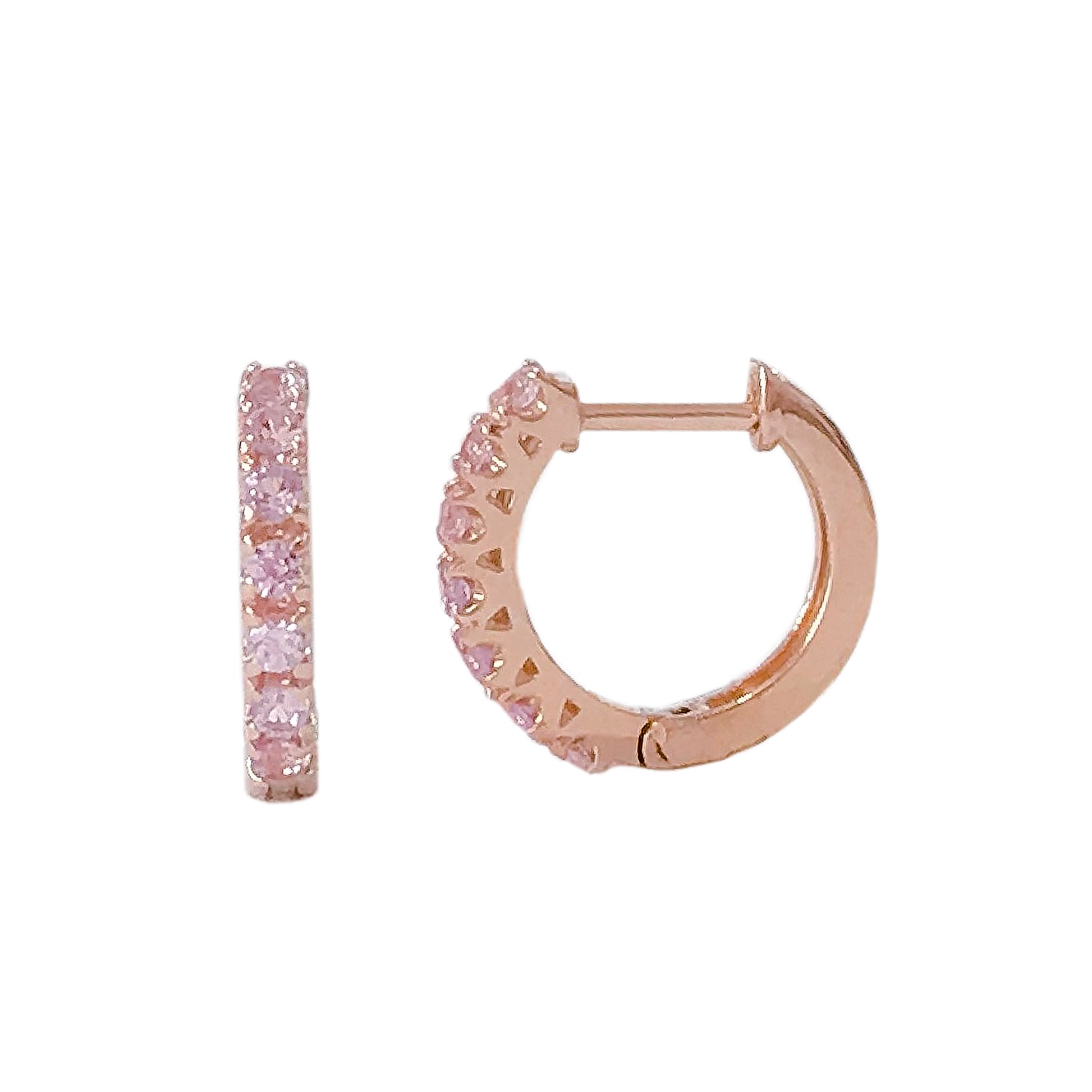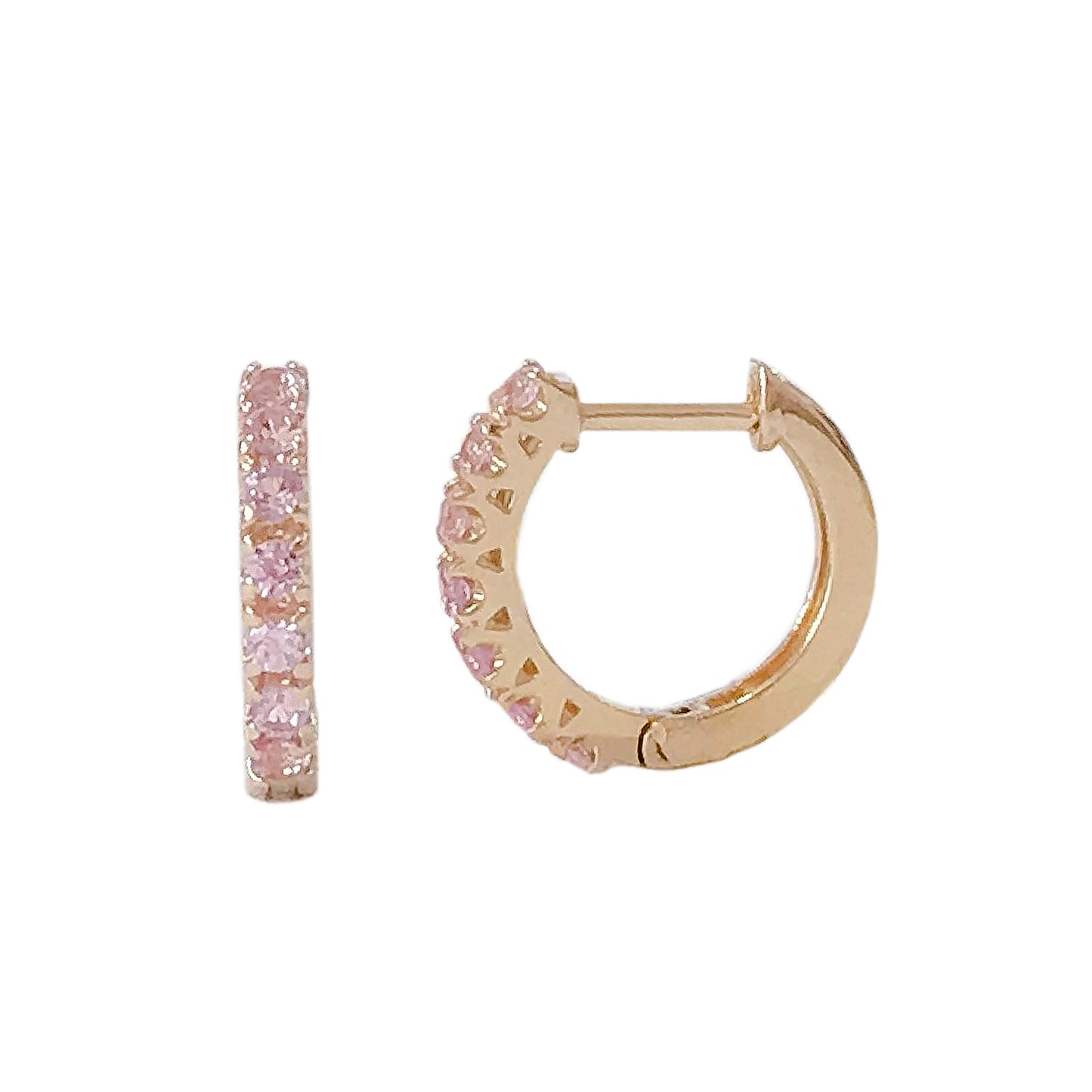This huggie hoop earring is composed of 14K solid gold and AAA quality round brilliant cut natural real Powder Pink Sapphire gemstones. This classic earring features a secure hinged closure for the ease of taking them on and off.