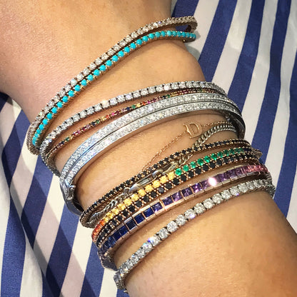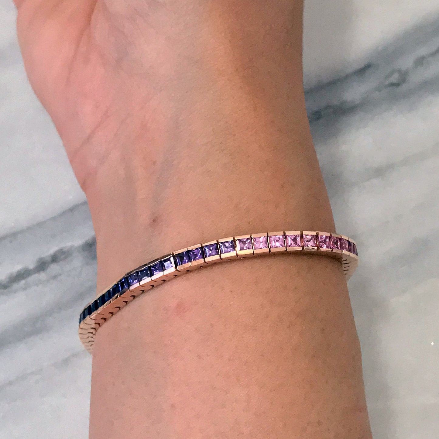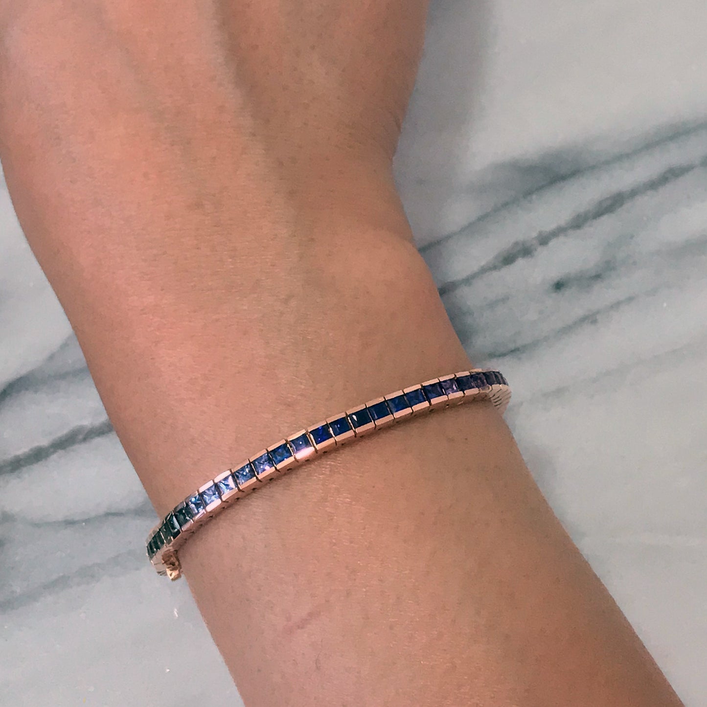 Our finely handcrafted tennis bracelet is composed of 14K solid gold and channel set with AAA quality princess cut genuine natural real colored Sapphires. This classic bracelet is finished with a secure snap lock closure and security clasp for safety. The setting and mounting quality is guaranteed for everyday wear.
