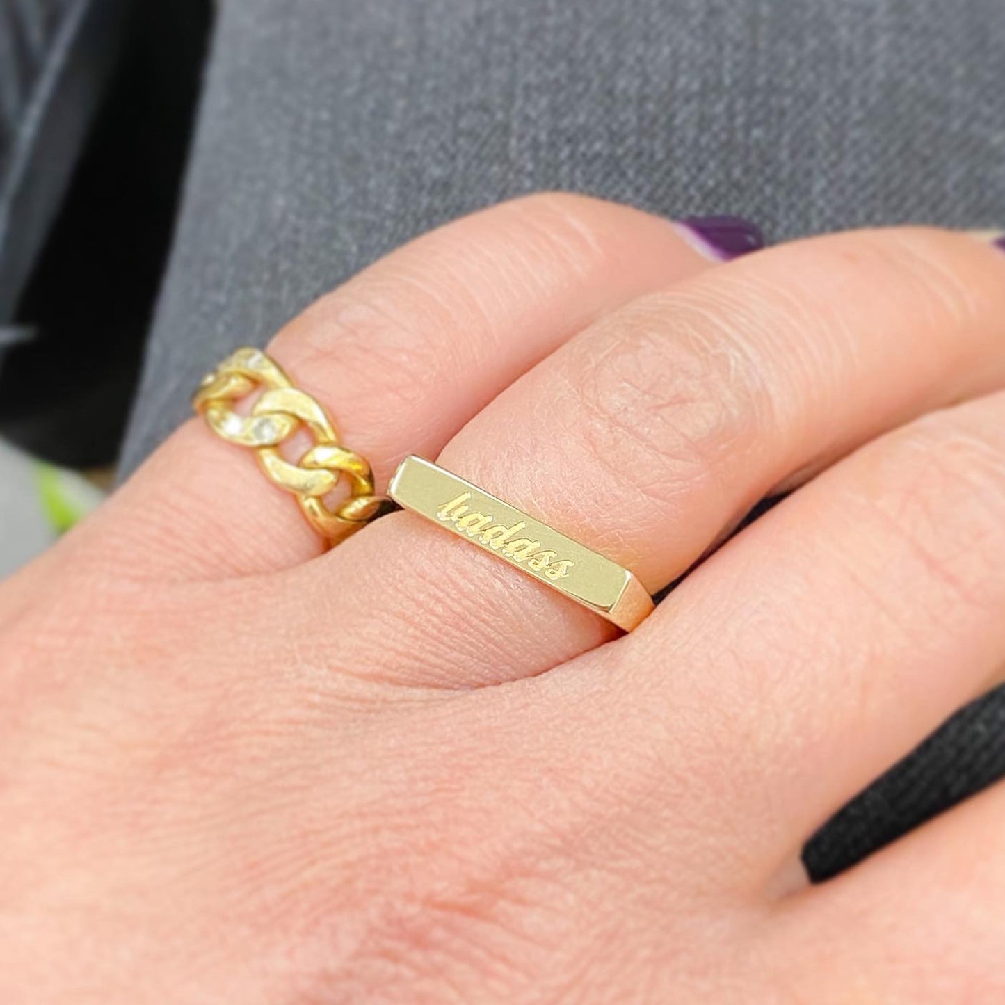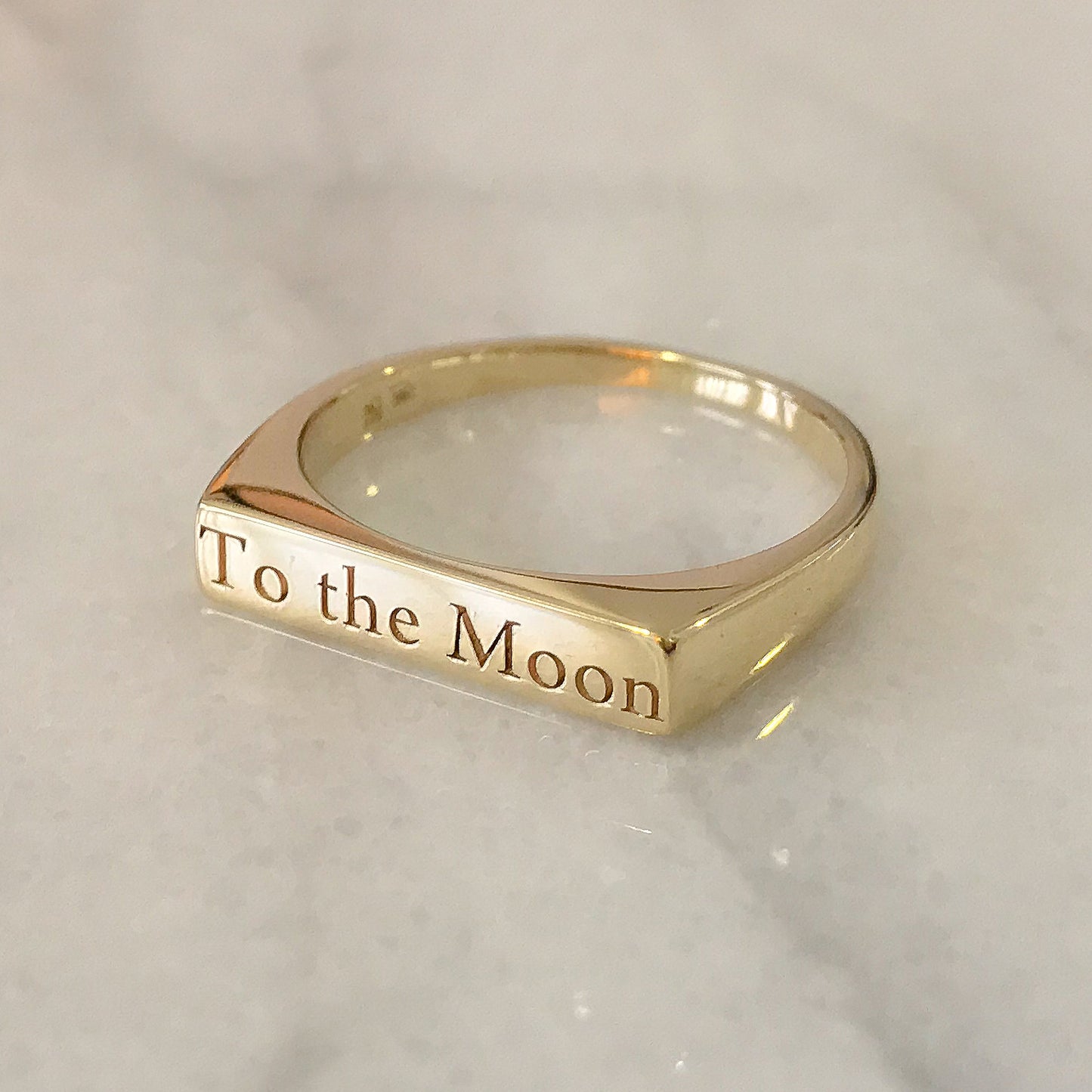 This rectangular shaped signet style ring is composed of 14K solid gold & can be finished with any font style engraving of any monogram initials, name, word or Roman numerals desired. Either way, with or without engraving this ring will be a great addition to your collection. This ring is entirely solid (NOT hollowed out on the inside) making is also possible for gemstone setting.