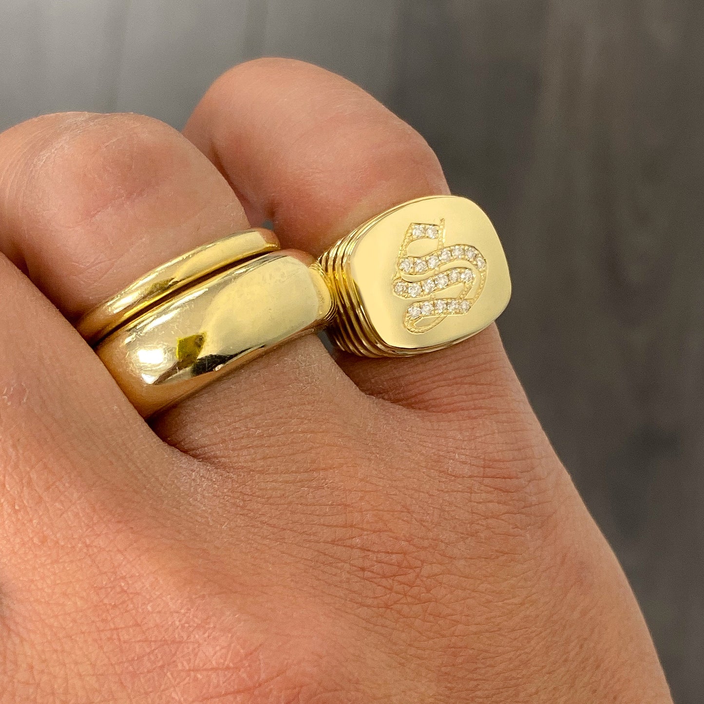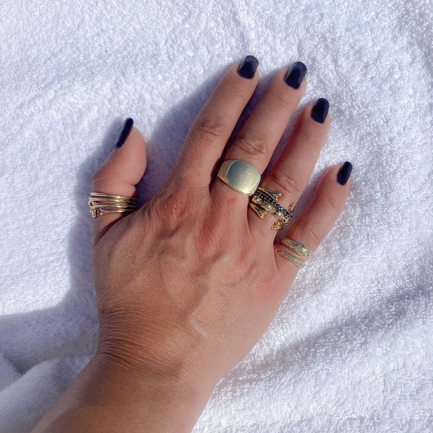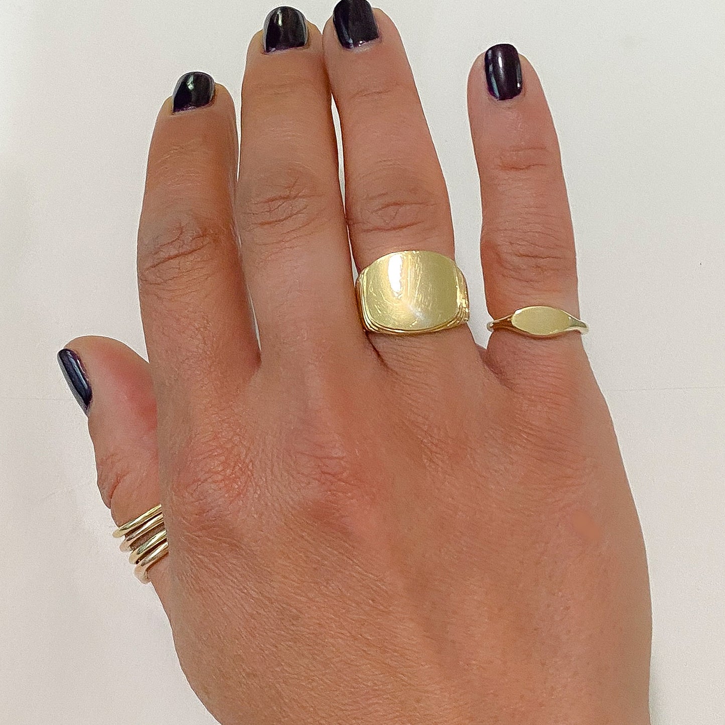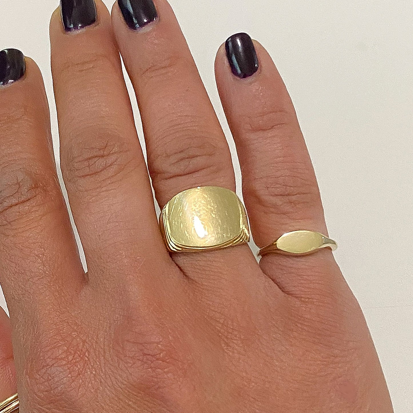 This uniquely shaped signet style ring is composed of 14K solid gold & can be finished with personalized monogram initials or phrase in any font style desired.