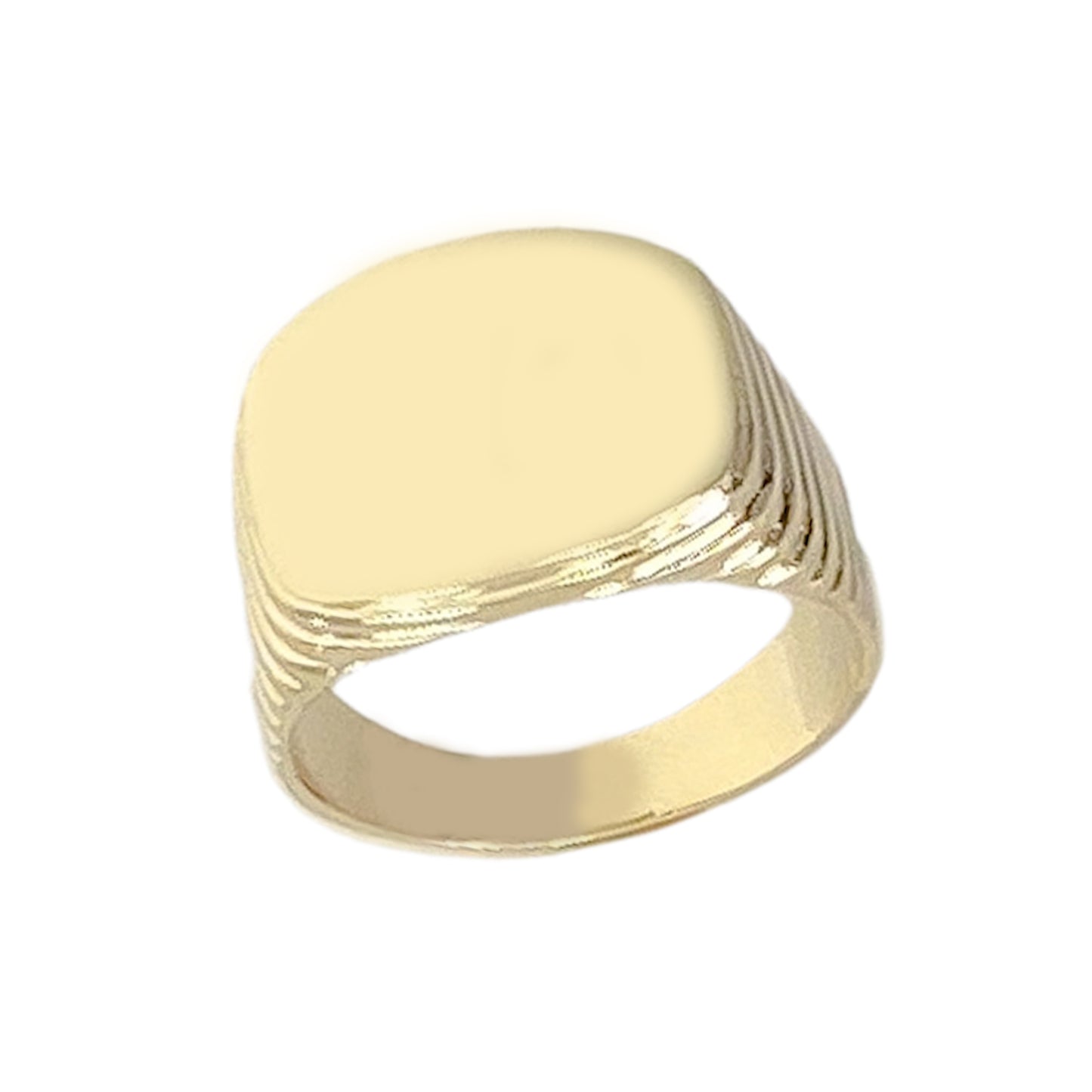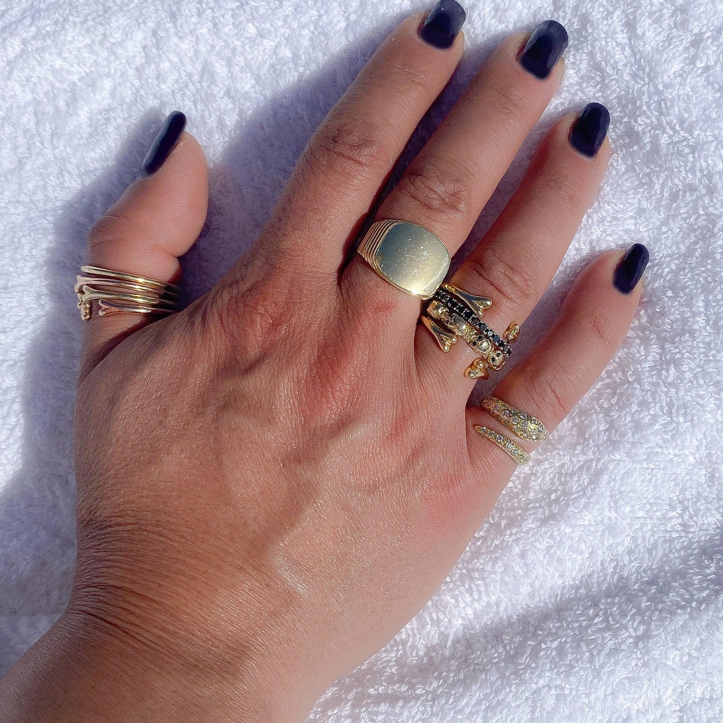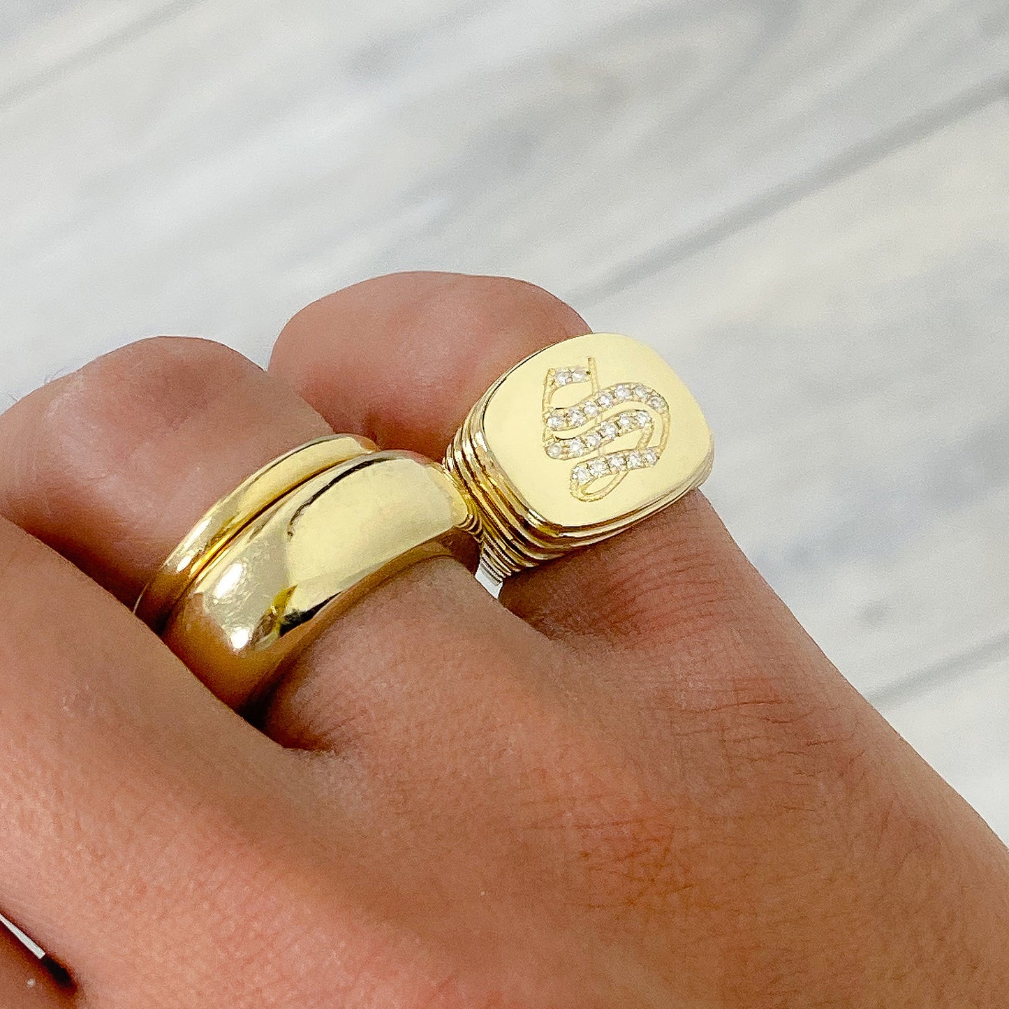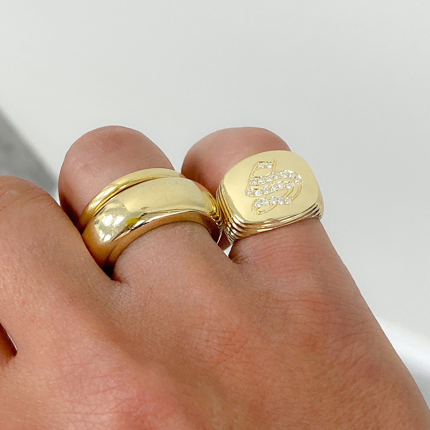 This uniquely shaped signet style ring is composed of 14K solid gold & can be finished with personalized monogram initials or phrase in any font style desired.