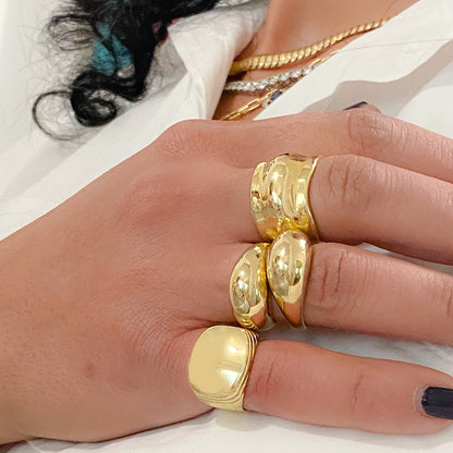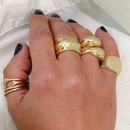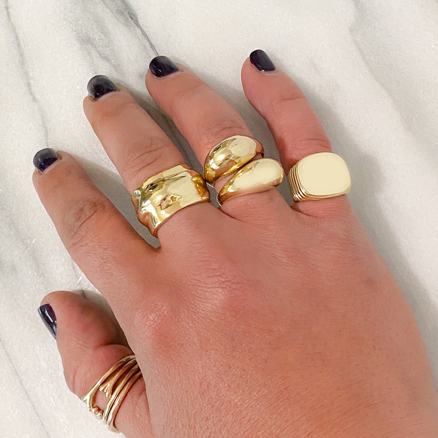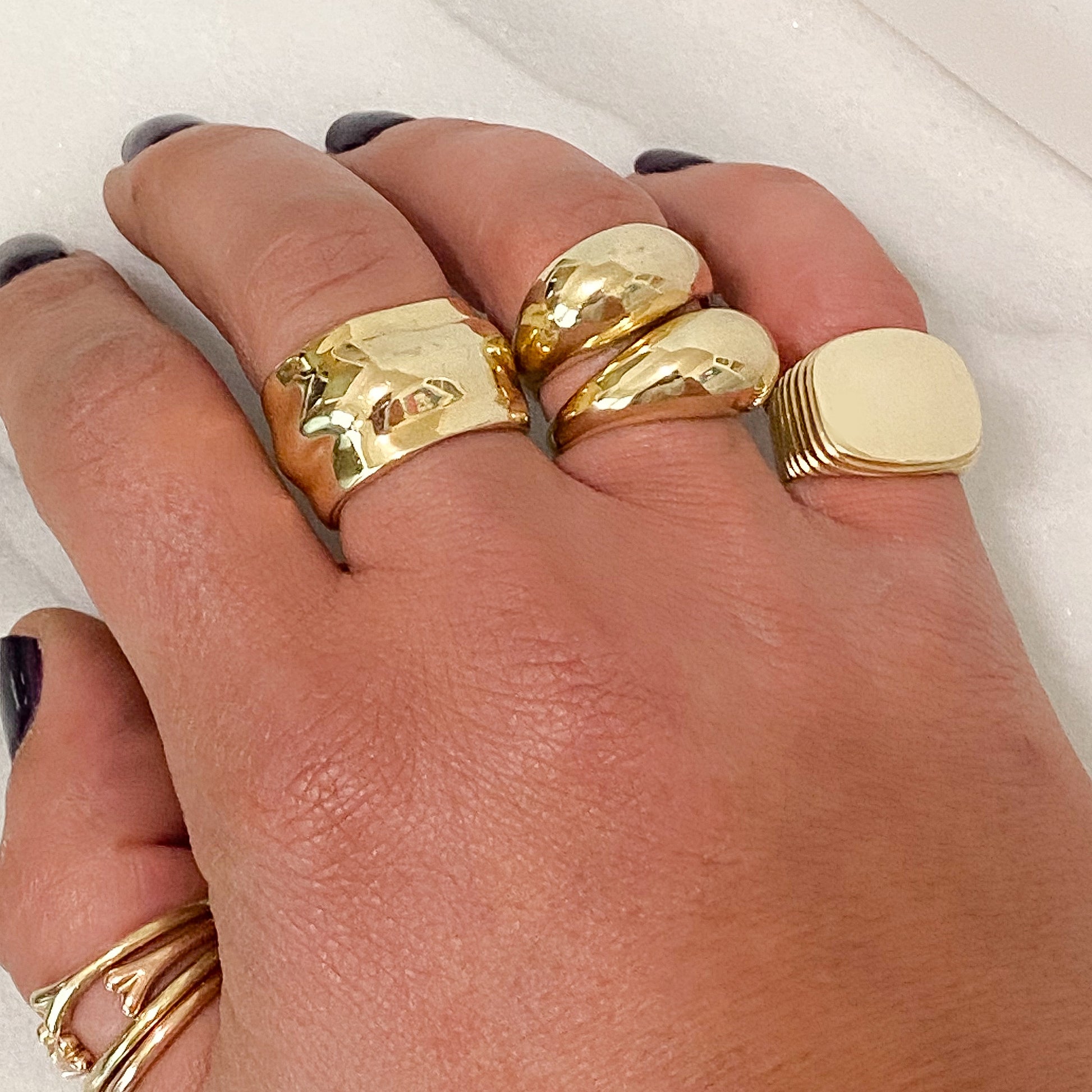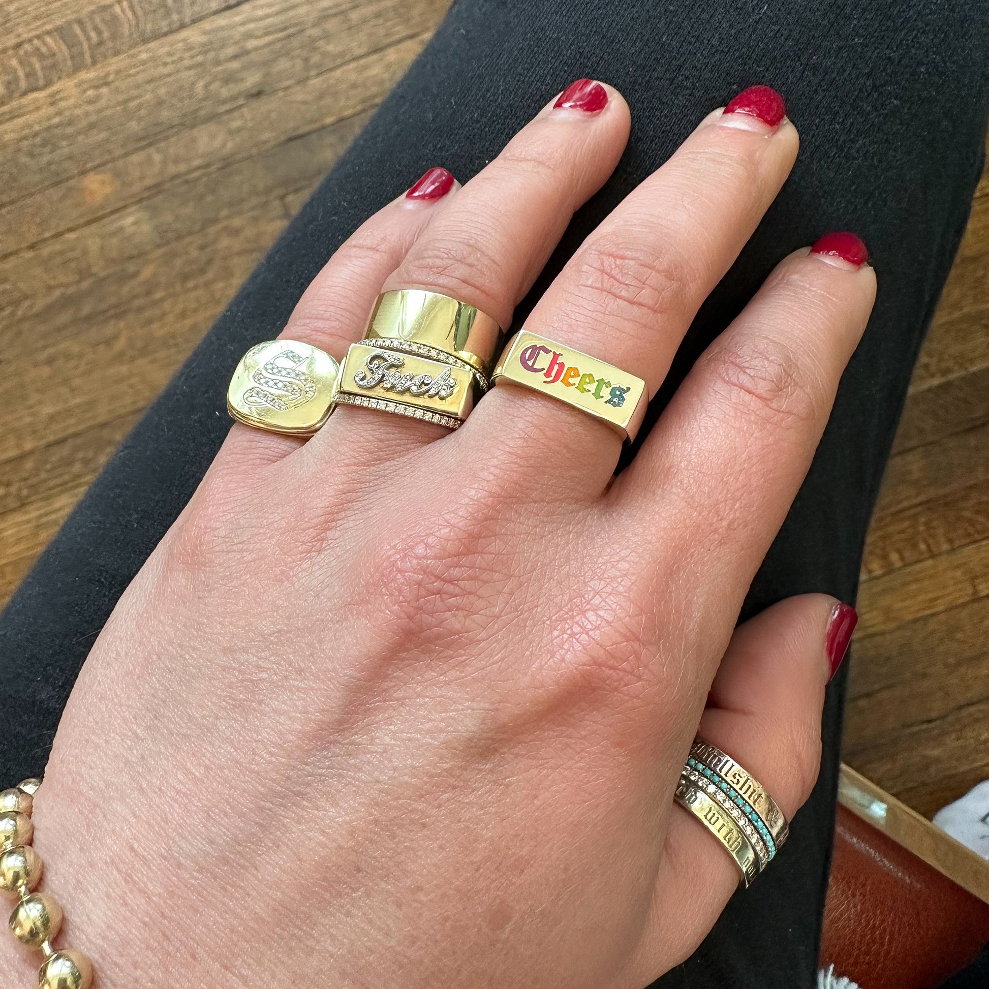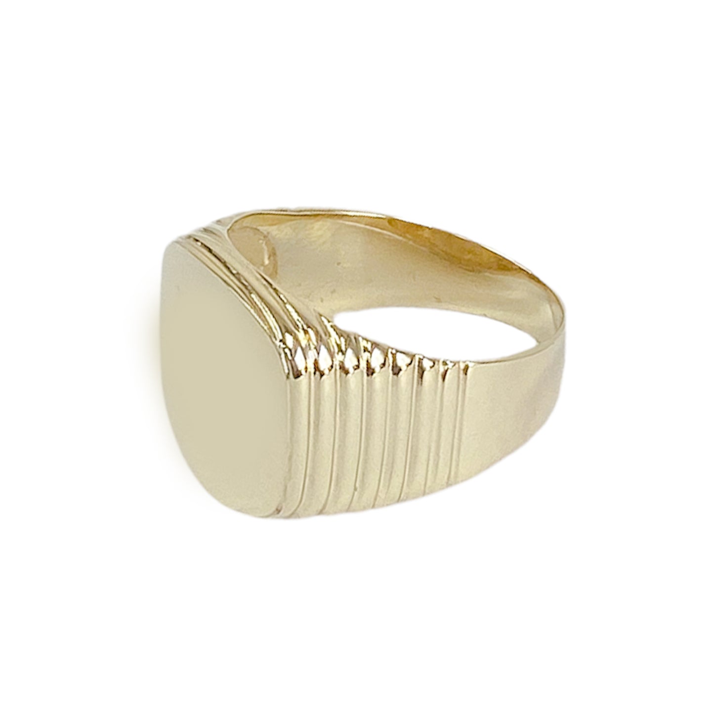 This uniquely shaped signet style ring is composed of 14K solid gold & can be finished with personalized monogram initials or phrase in any font style desired.