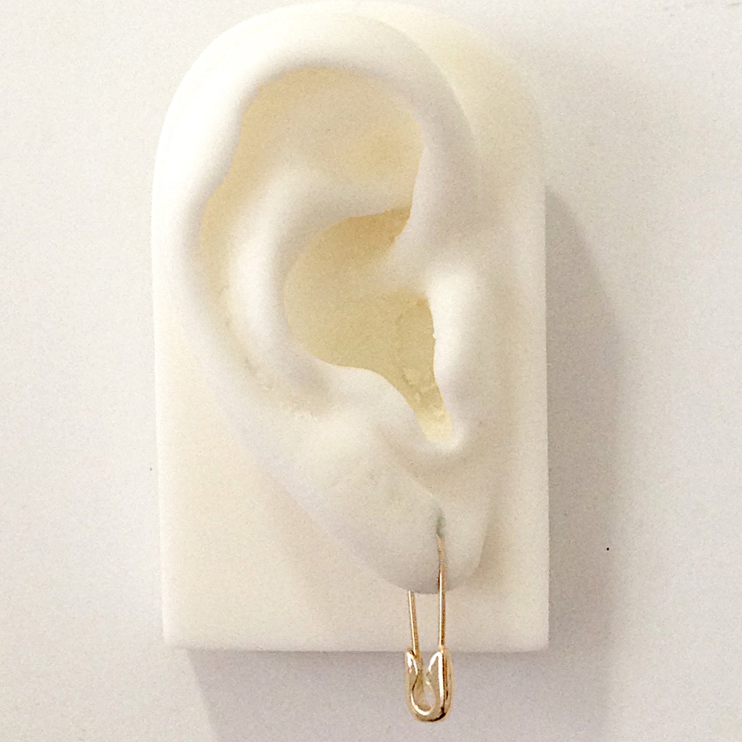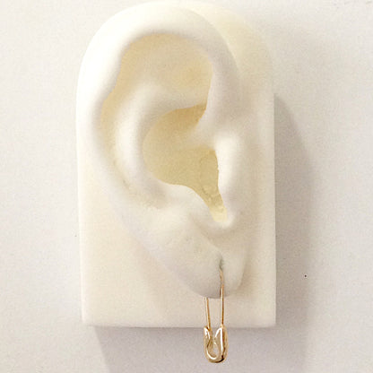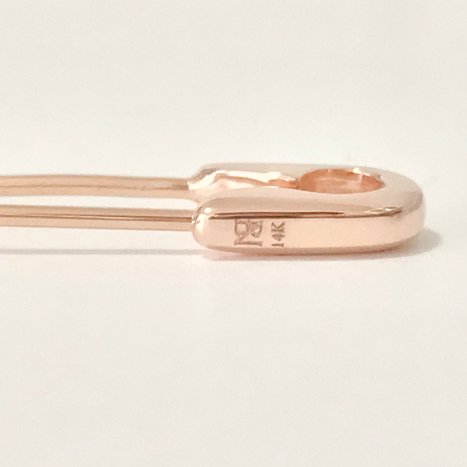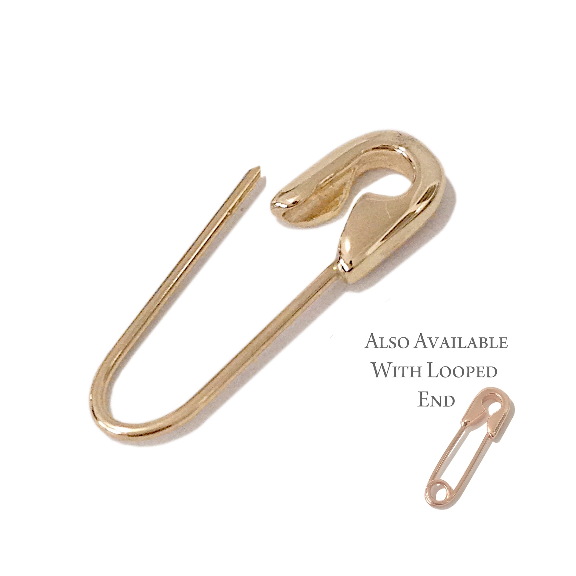 This unique safety pin style brooch is completely composed of 14K solid gold. The brooch is designed with a strong wire so that it is sharp enough to pierce through virtually any fabric and versatile so that any personal or Nana Bijou charm can be easily added through to dangle from the pin for a more personalized statement.