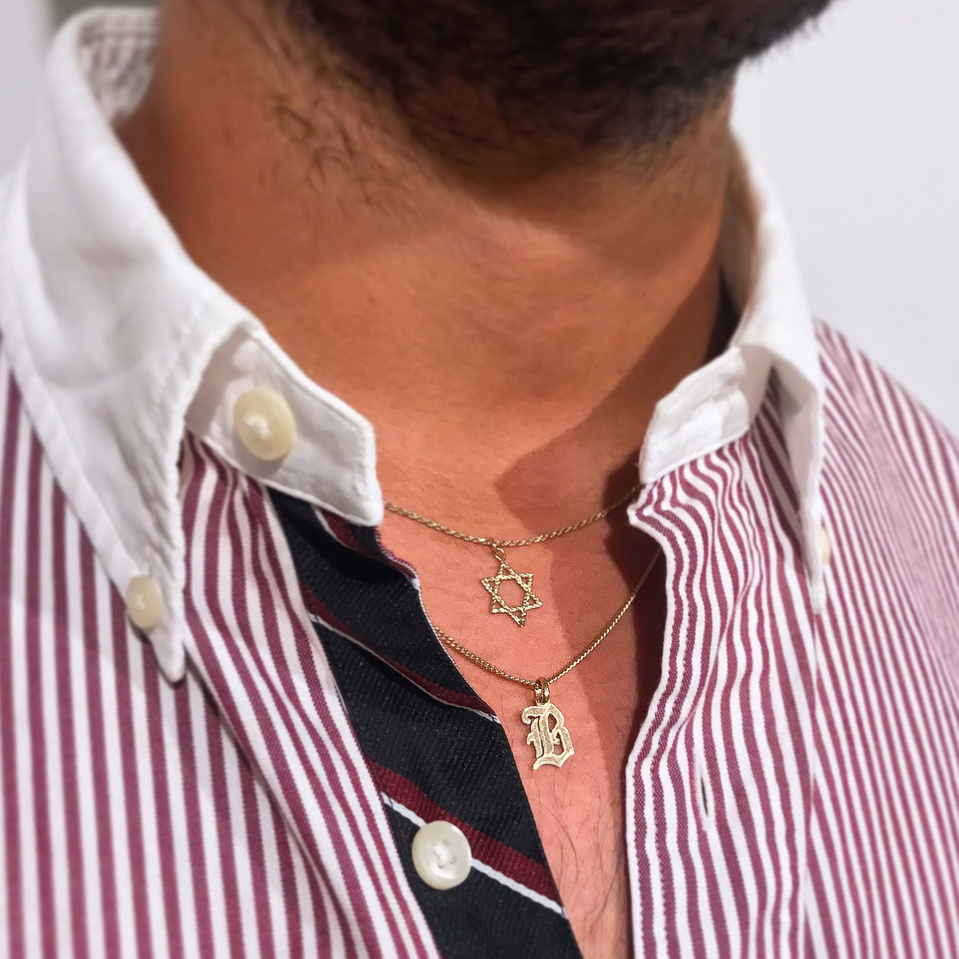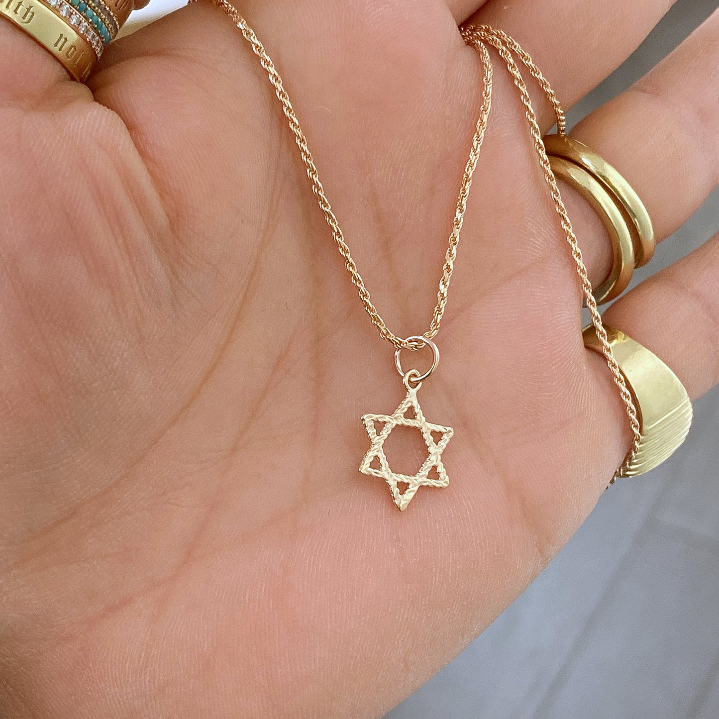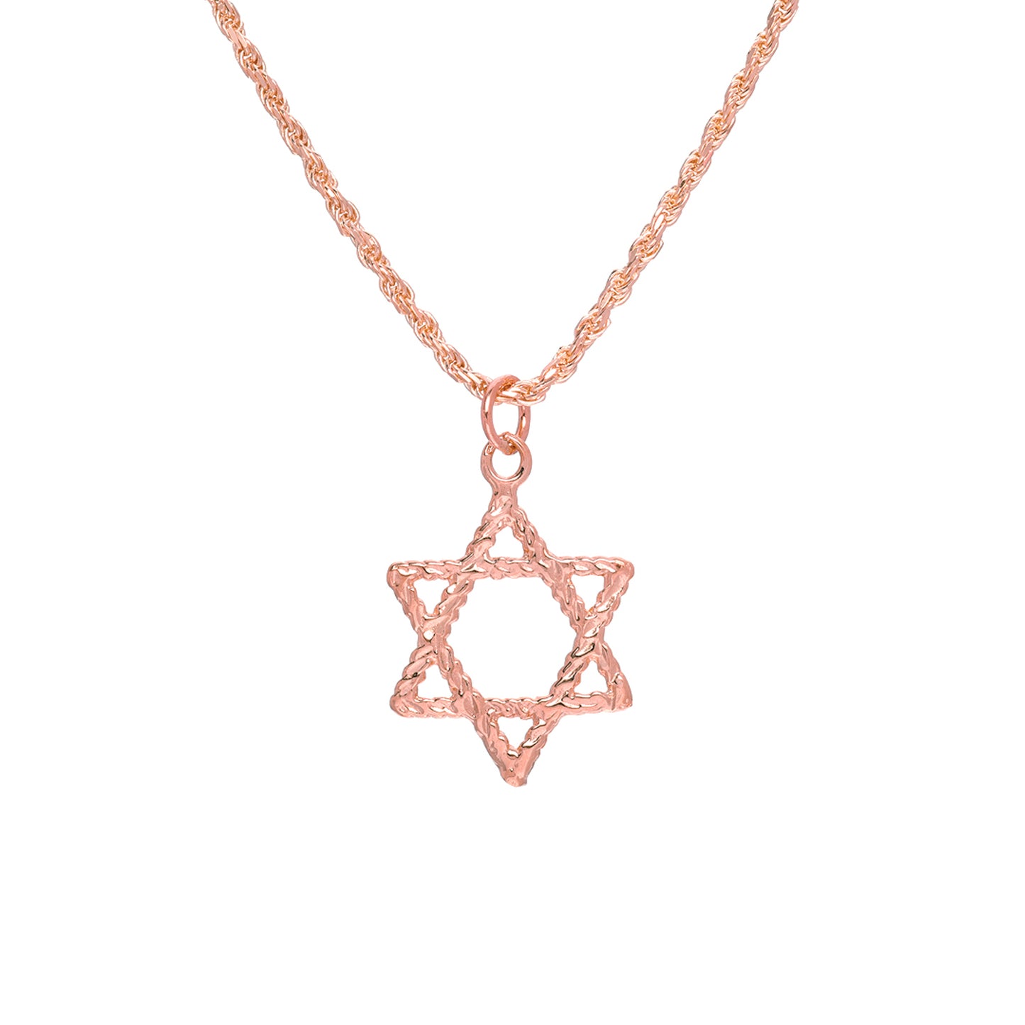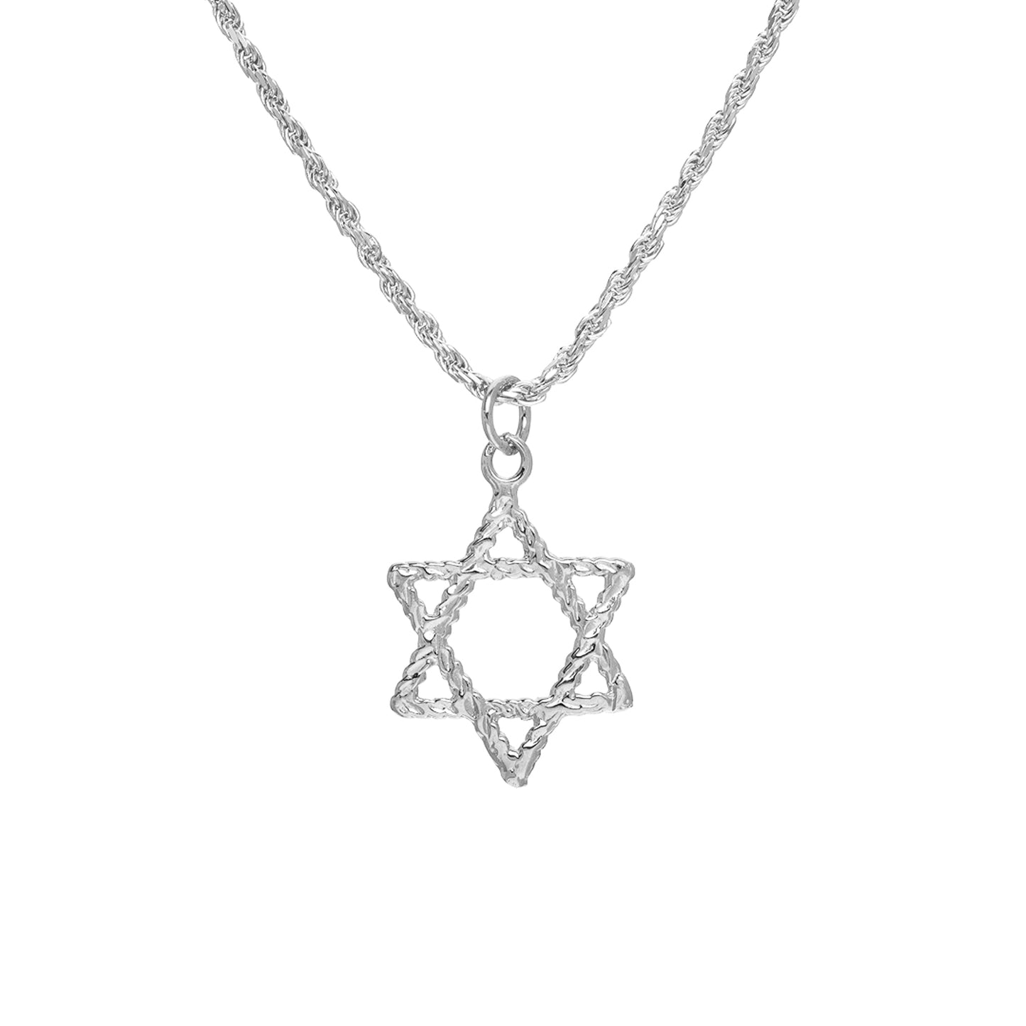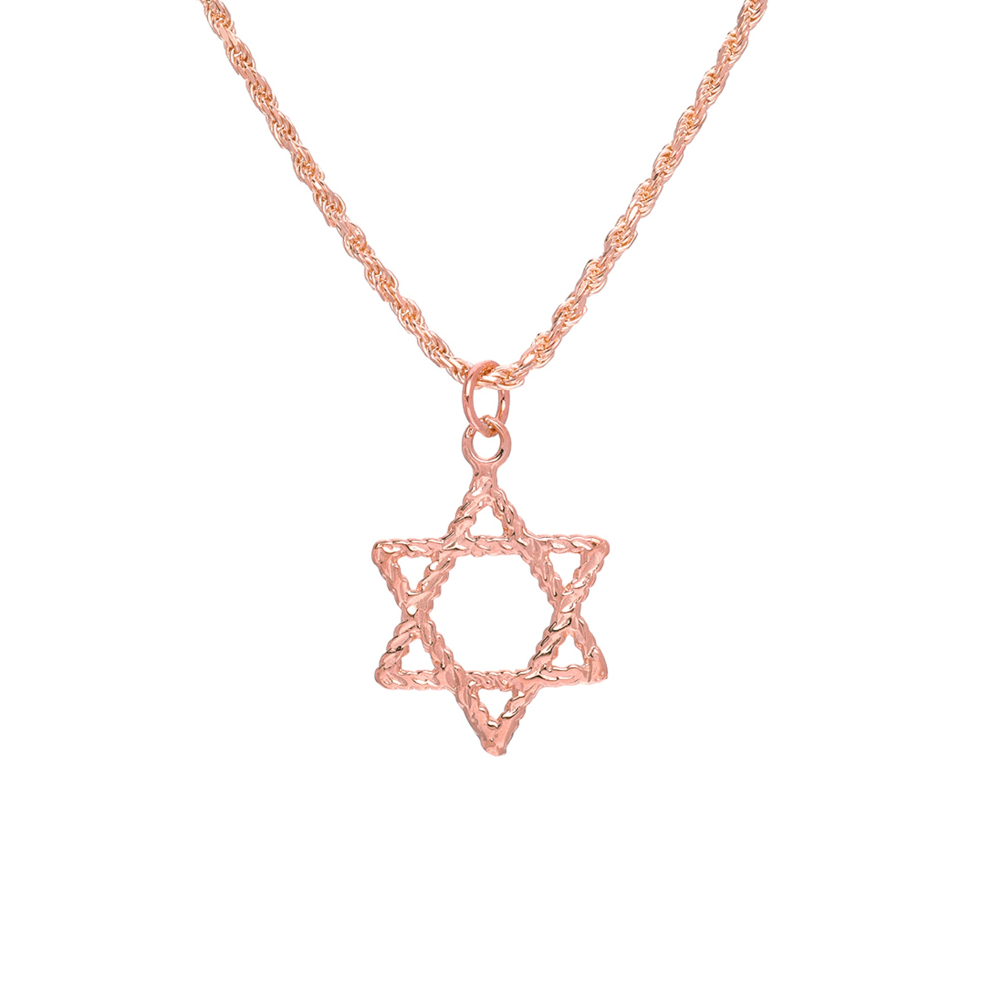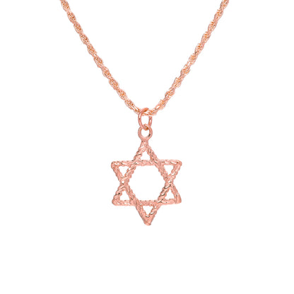 This meaningful pendant necklace is the universal symbol of the Jewish star, known as the Star of David.  The necklace is composed of 14K solid gold and beautifully complemented by a durable 14K solid gold rope style chain which is finished with a lobster claw clasp.
