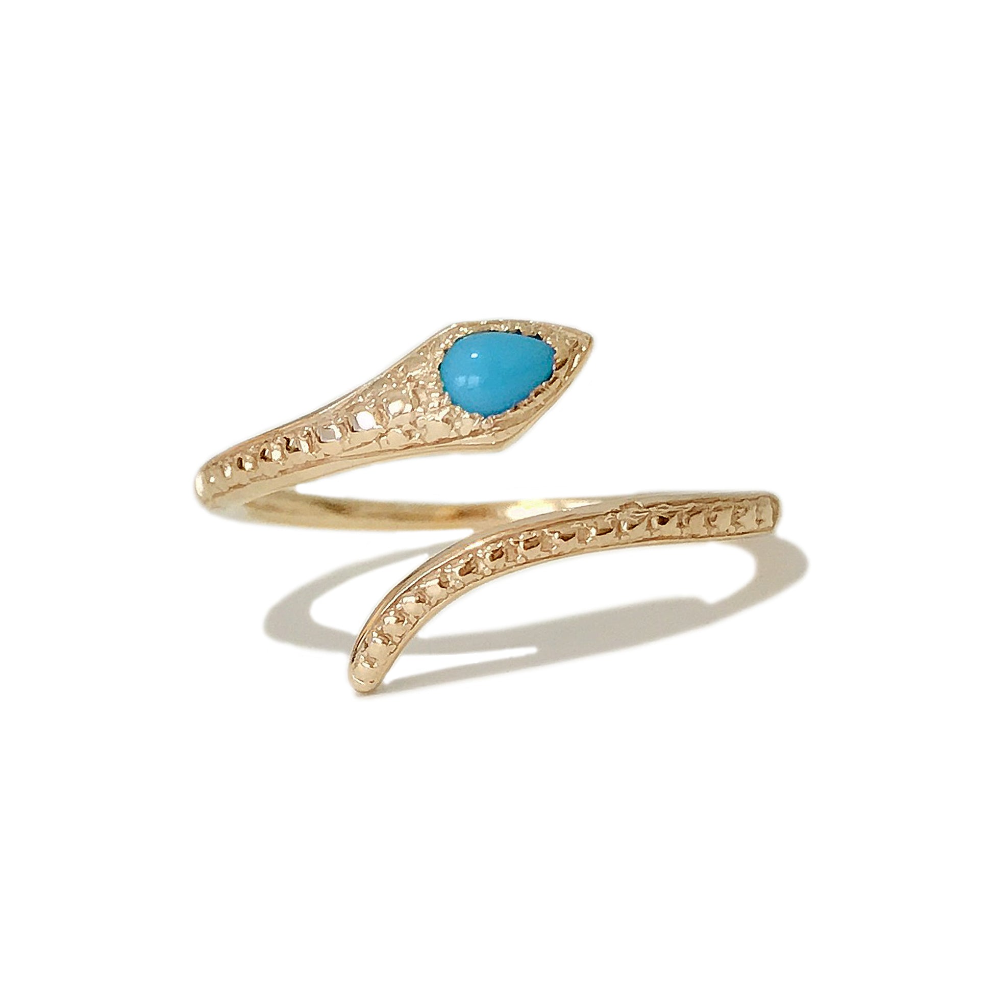 This finely handcrafted detailed snake bypass ring is made completely of 14K solid gold and finished with AAA quality genuine pear shaped cabochon cut Arizona Turquoise gemstone.