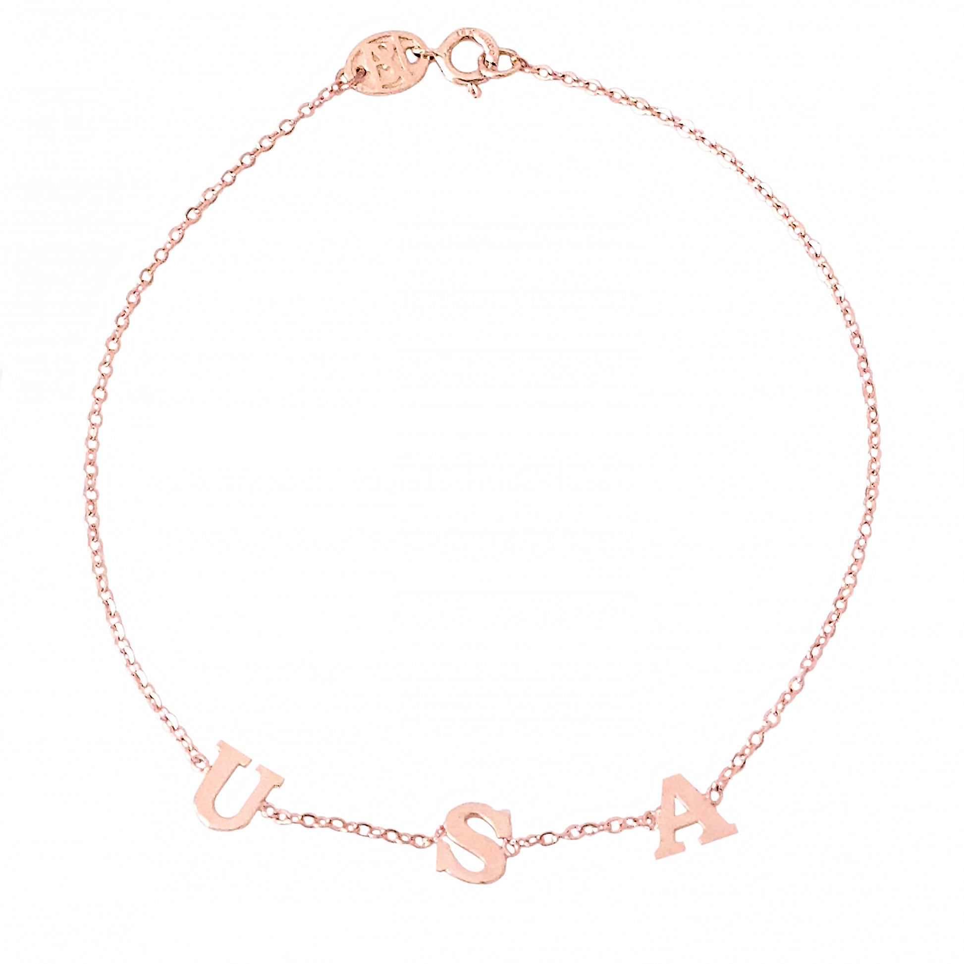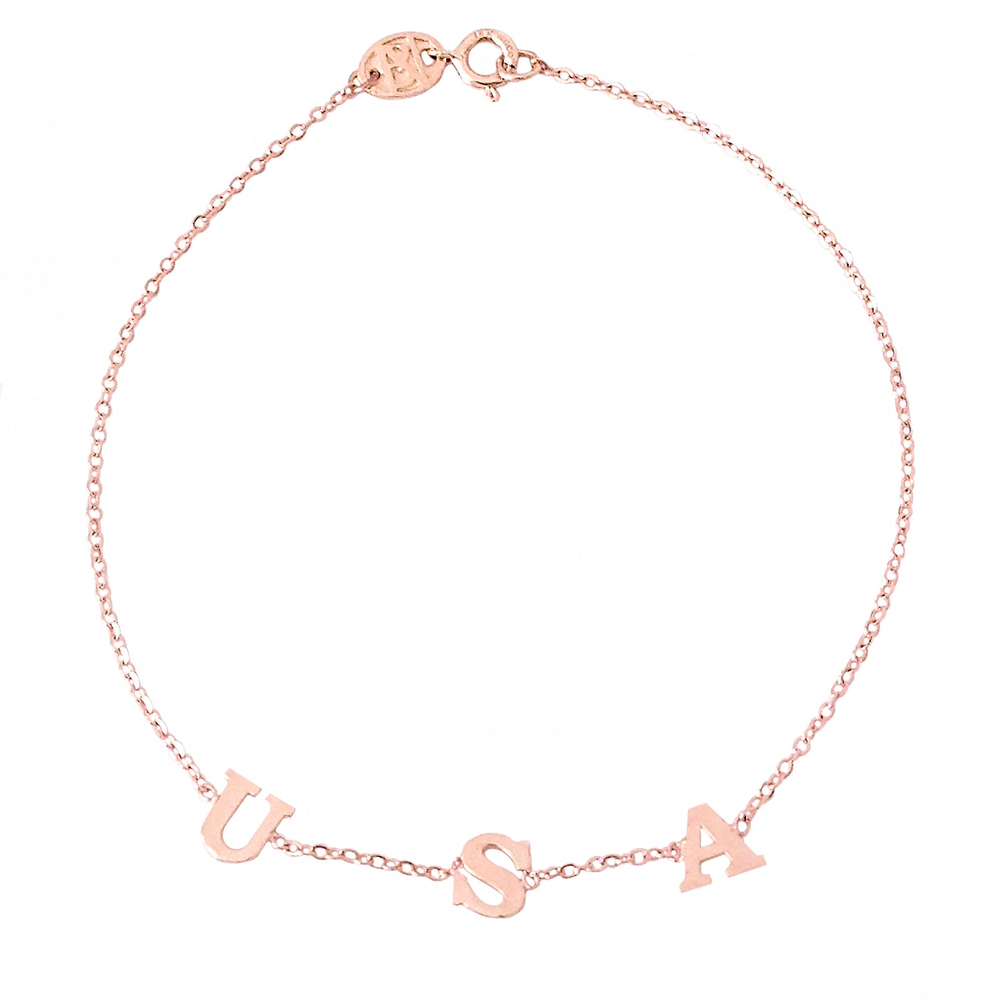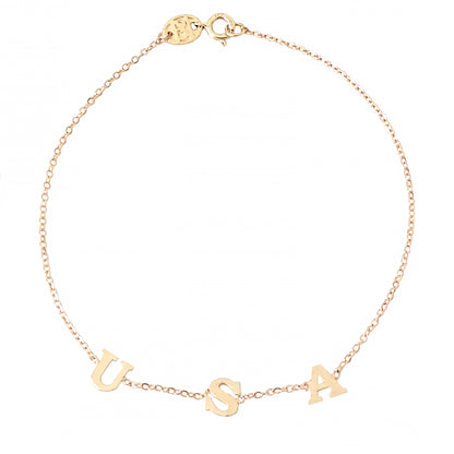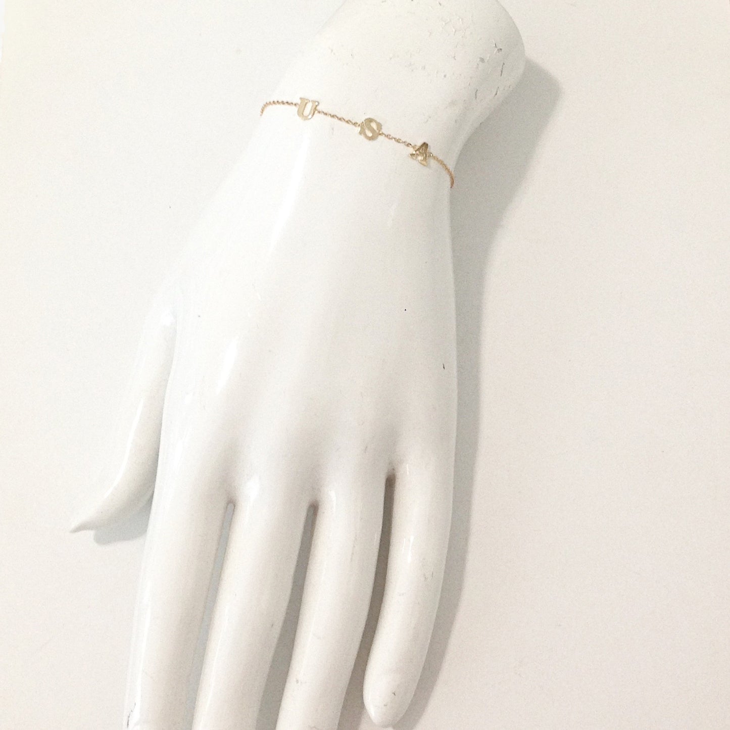 This unique & personalized triple initial letter cut-out bracelet is composed of 14K solid gold and beautifully complemented by a delicate yet durable 14K solid gold chain. This piece is adjustable in length from 6 to 7 inches.