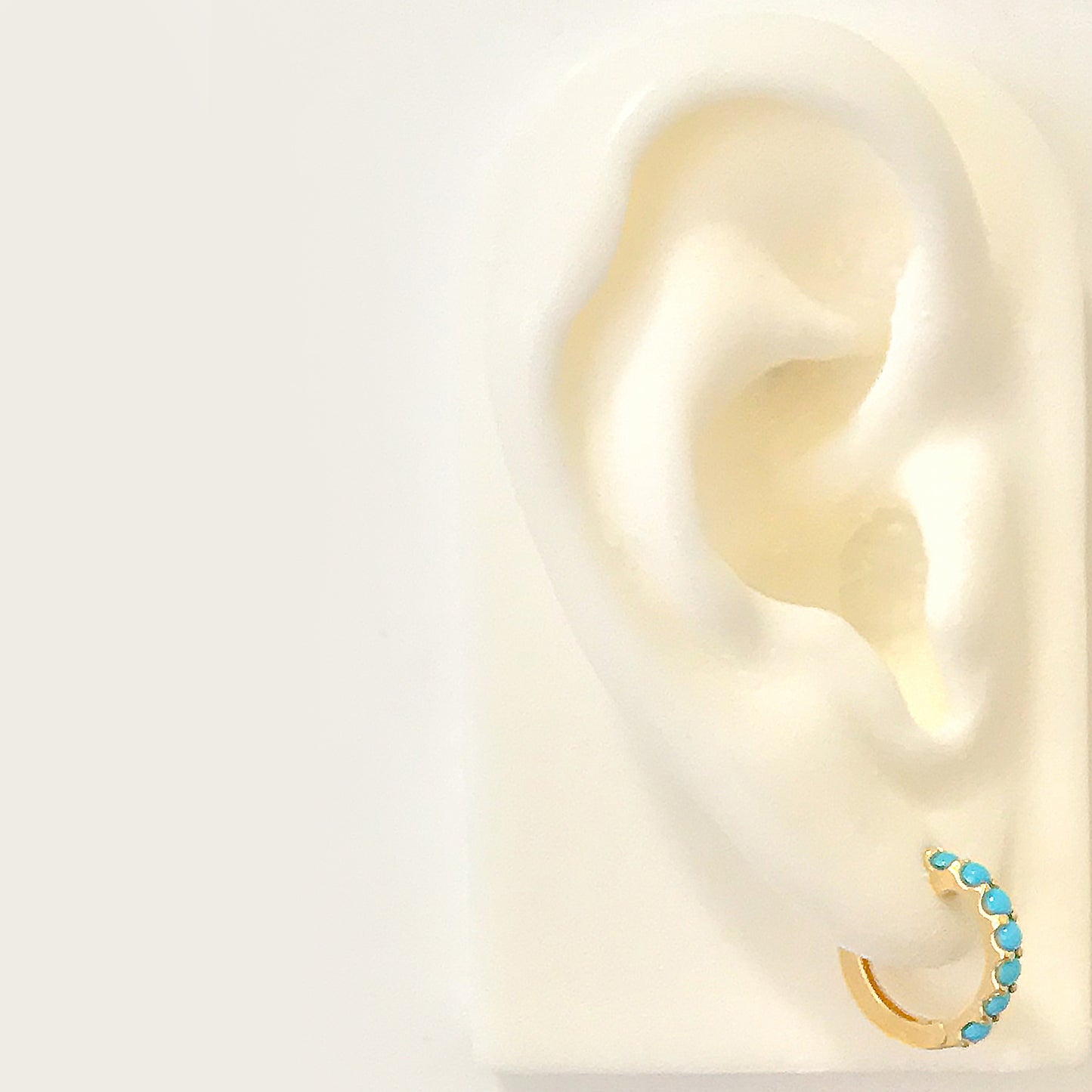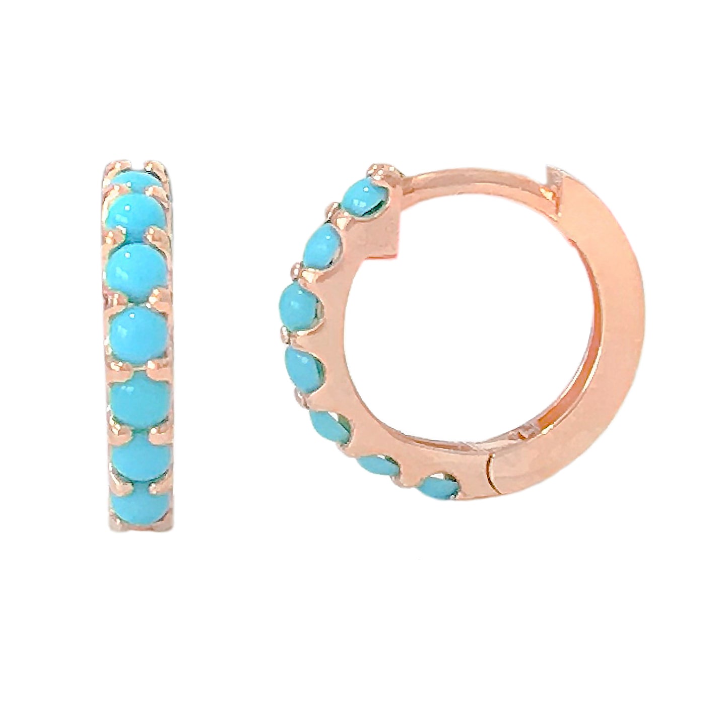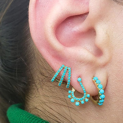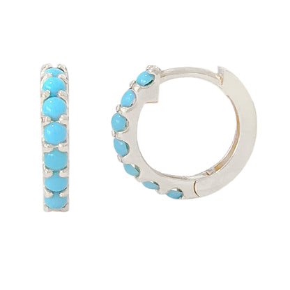 This huggie hoop dangle earring is composed of 14K solid gold and AAA quality round cabochon cut natural real Turquoise gemstones. This classic earring features a secure hinged closure for the ease of taking them on and off.