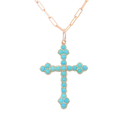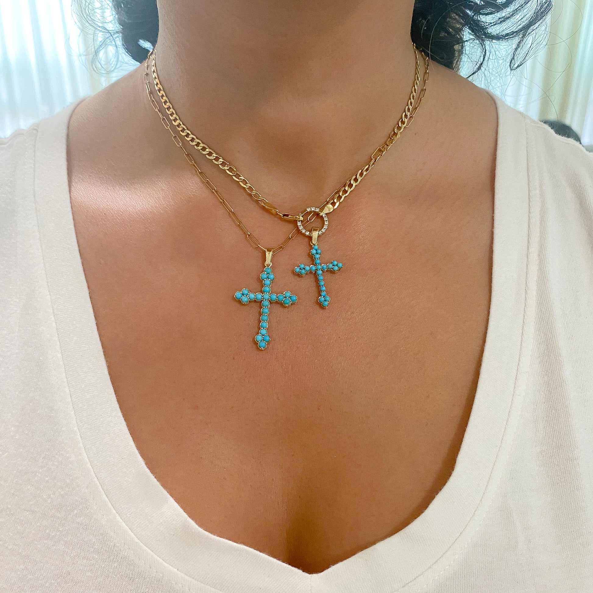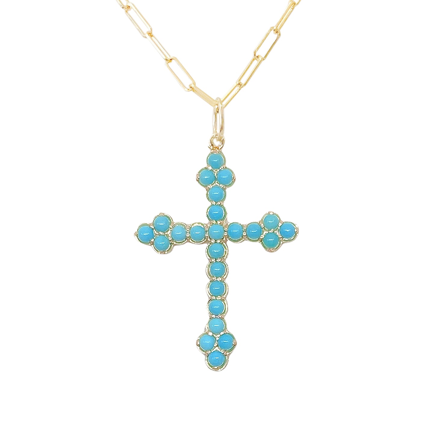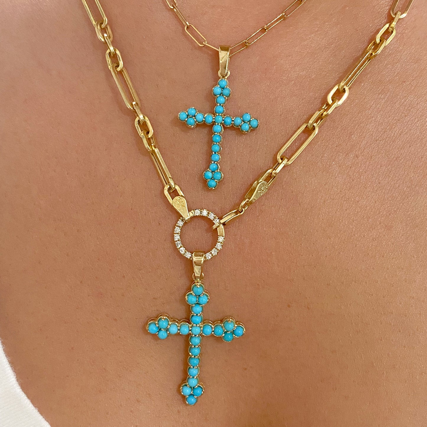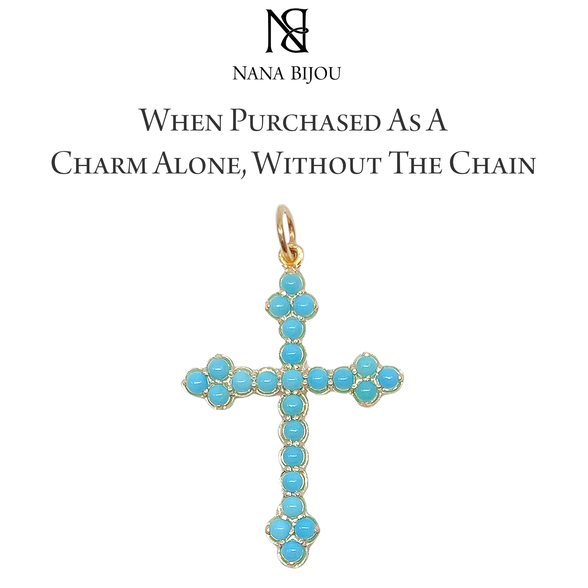 This finely handcrafted cross pendant is composed of 14K solid gold and beautifully complemented by genuine AAA quality round cabochon cut natural real Turquoise gemstones. This charm comes with a durable adjustable 14K solid gold open link chain, finished with a secure lobster claw clasp. This design can also be purchased as a charm alone without the chain.