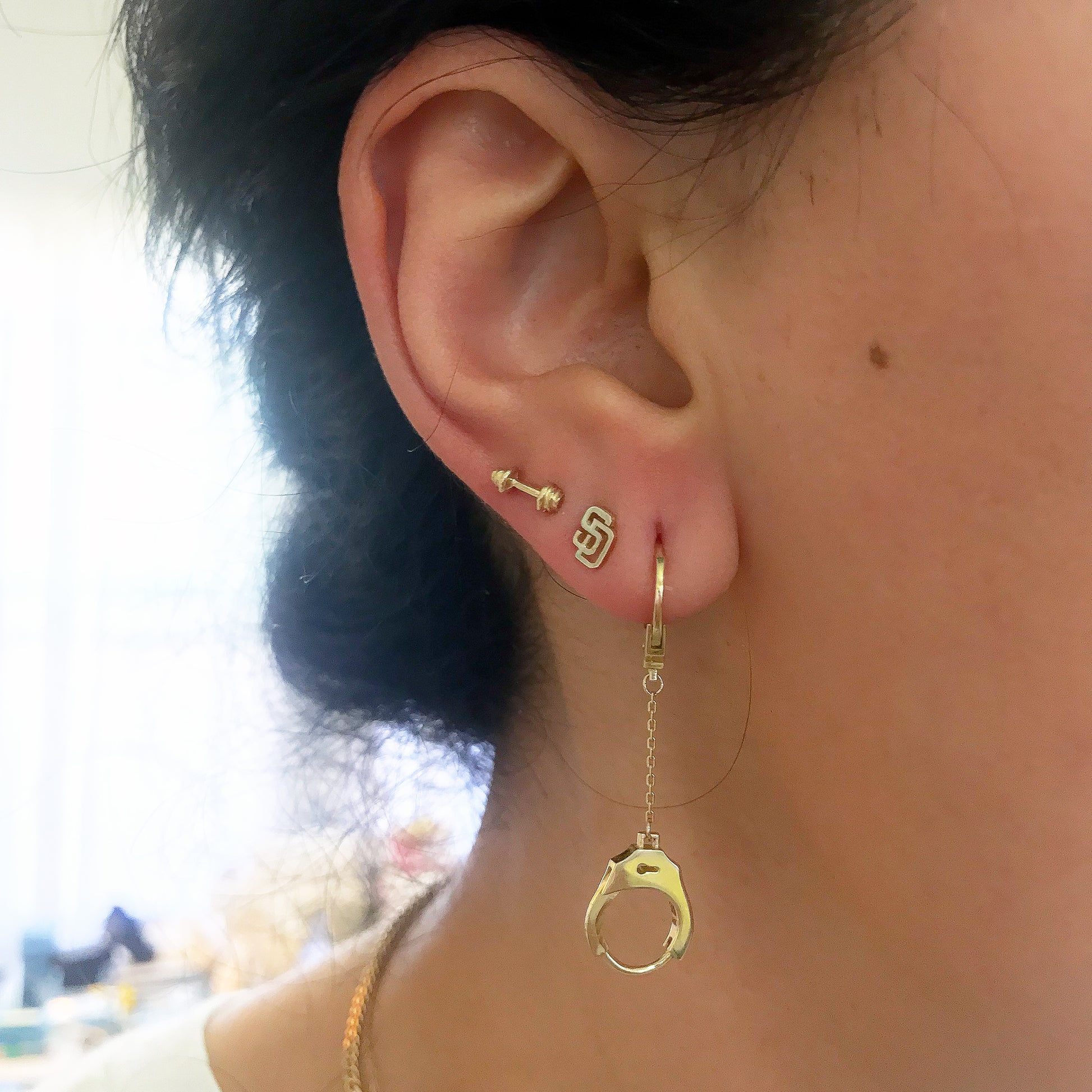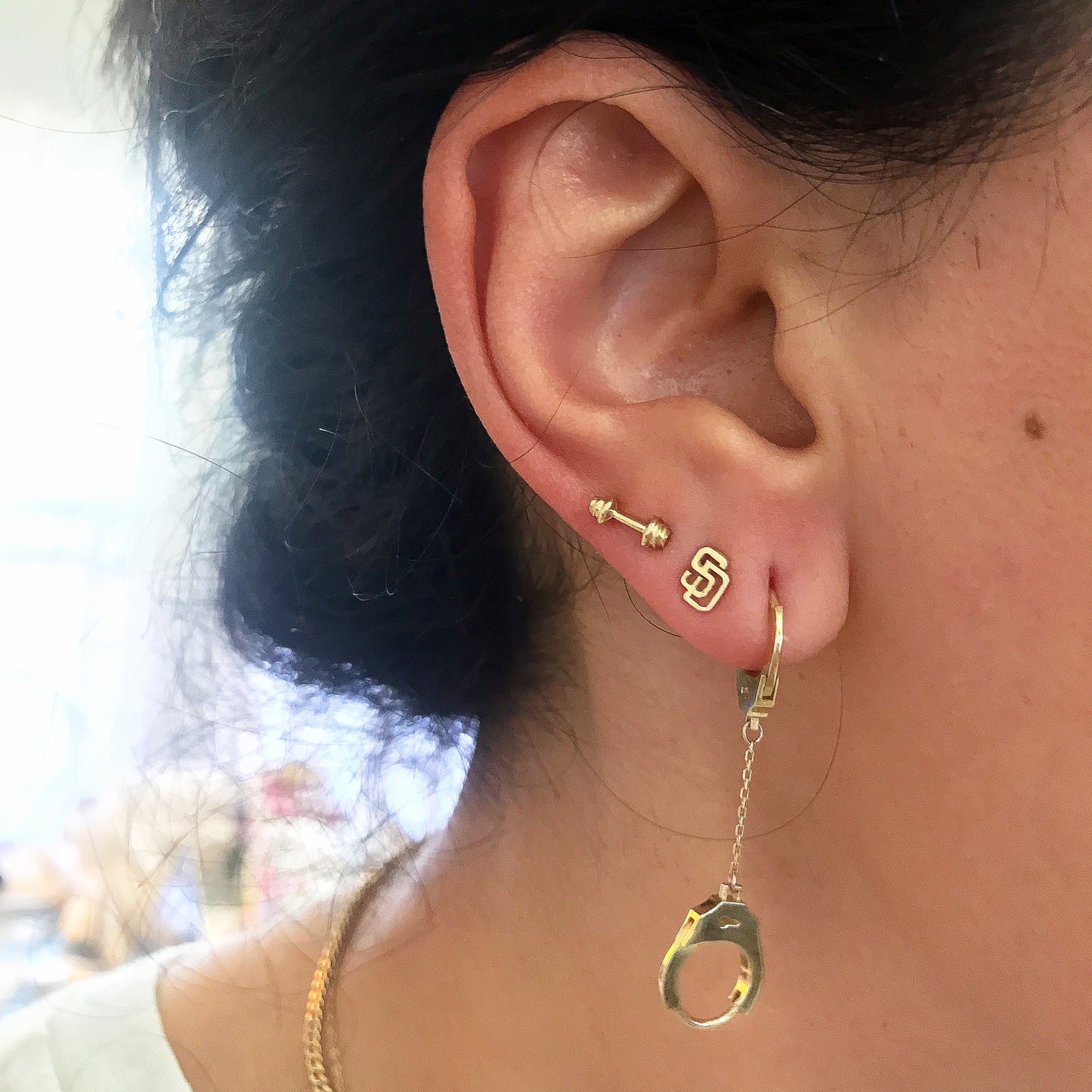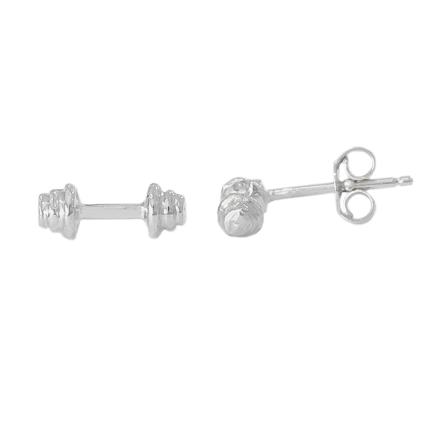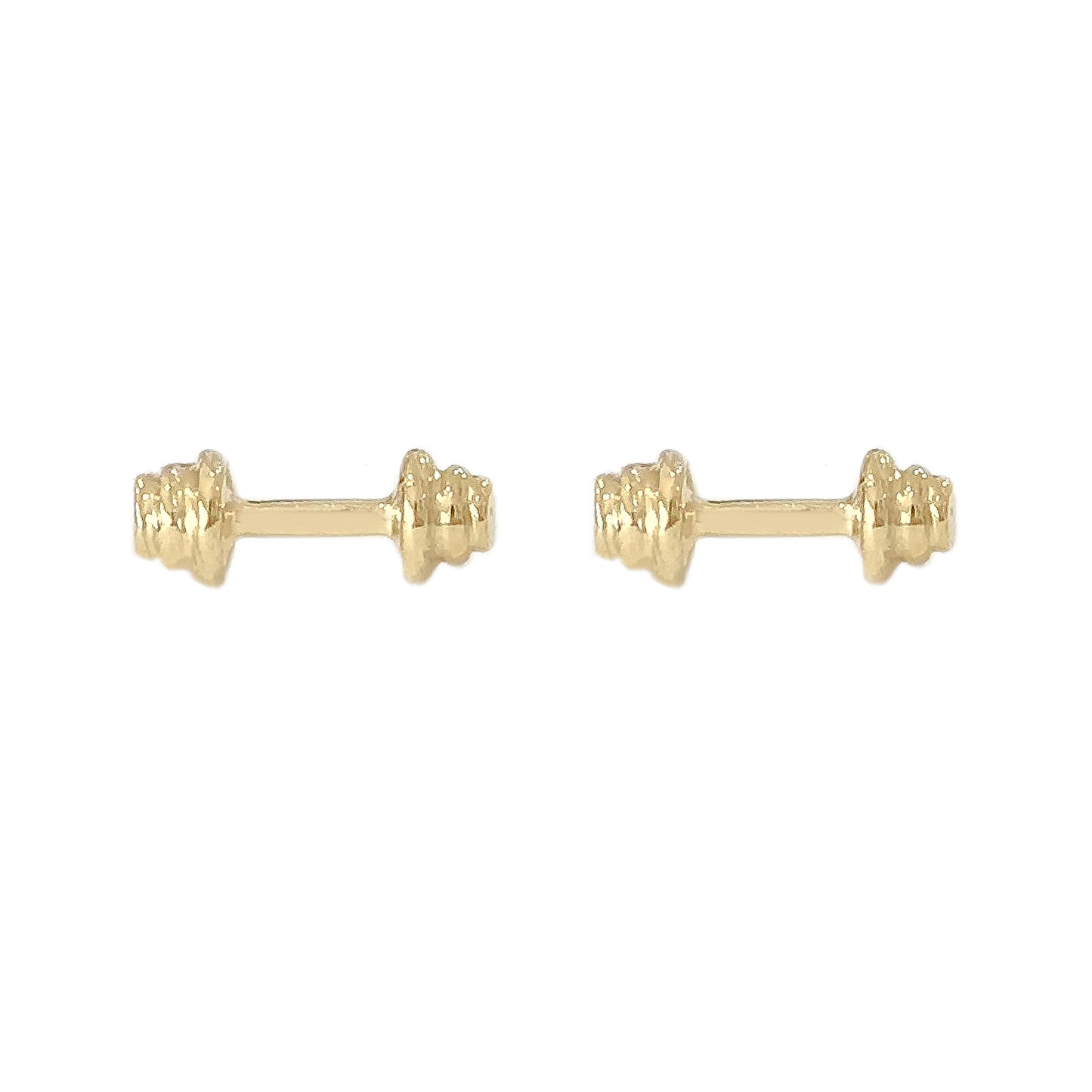 This tiny detailed dumbbell stud earring is composed of 14K solid gold. Comes with matching 14K solid gold secure earring backs.