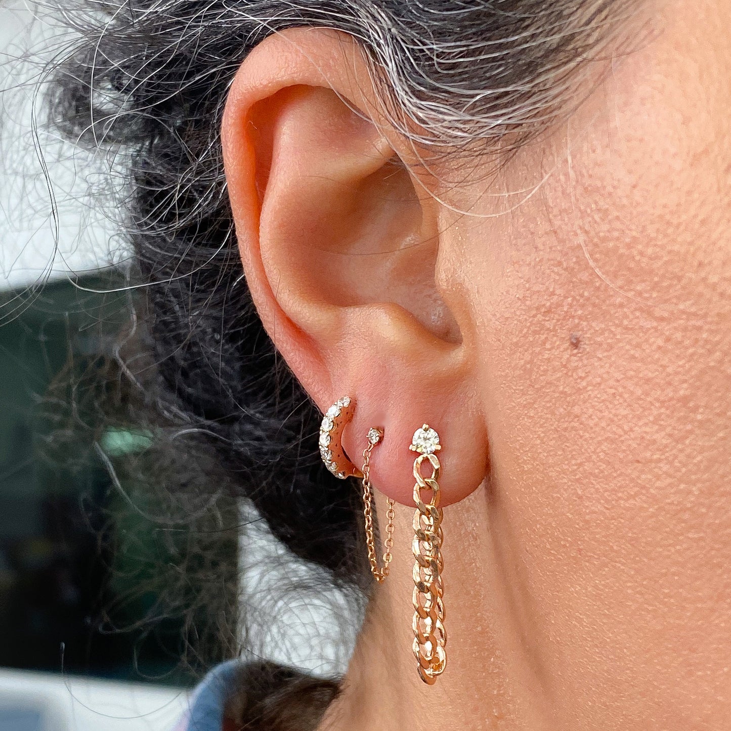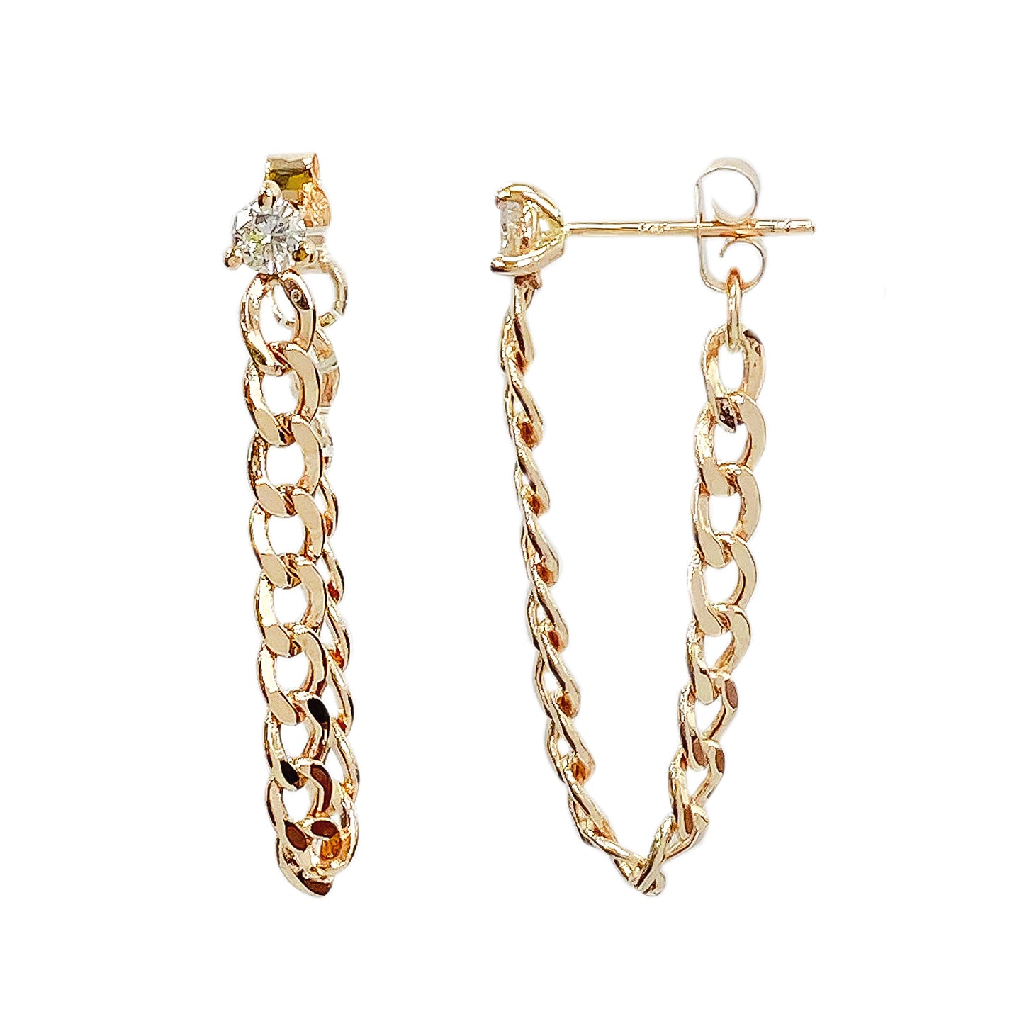 3mm Diamond Solitaire 14K Gold Open Curb Link Chain Dangle Stud Earrings