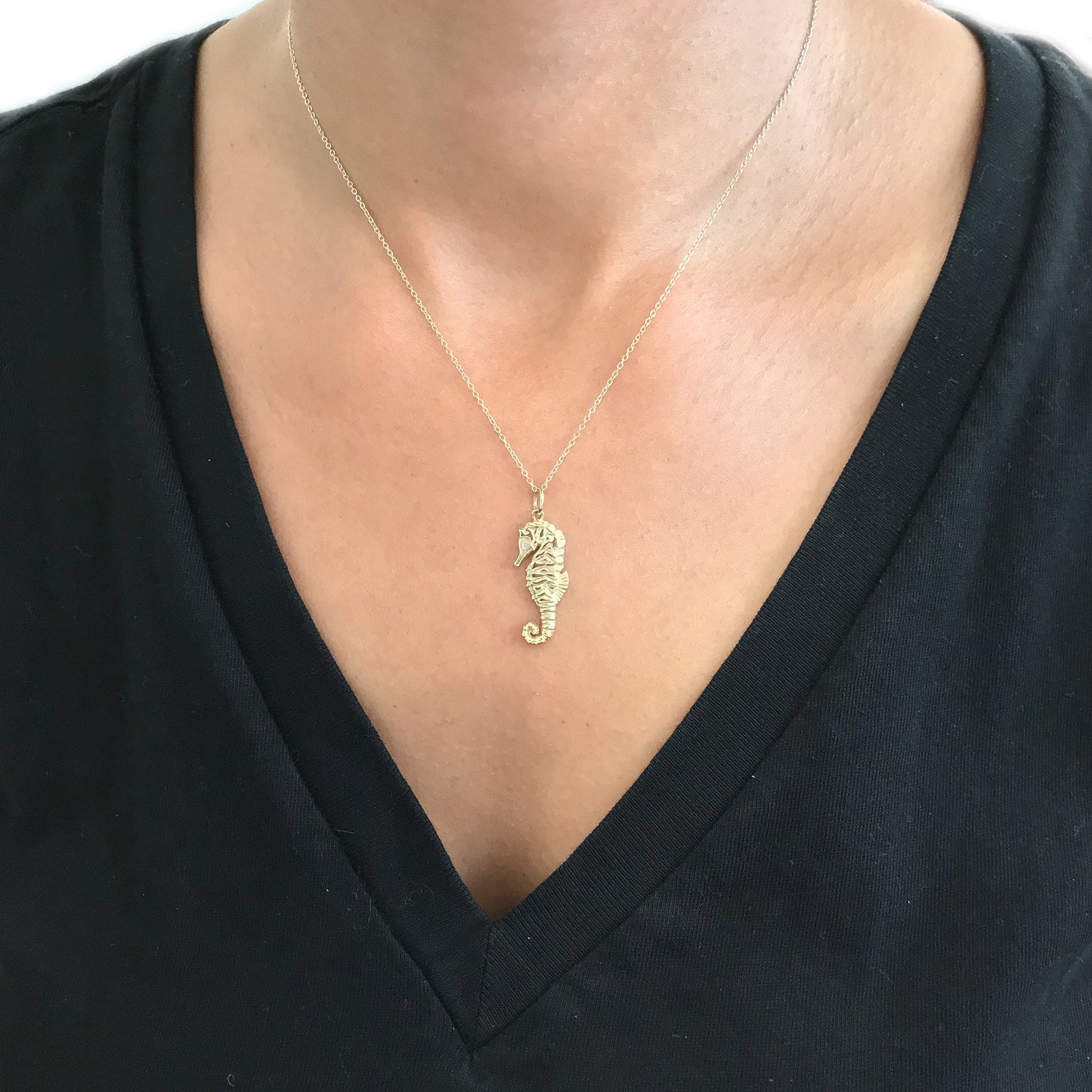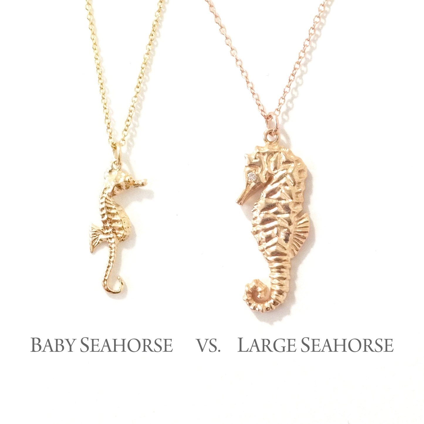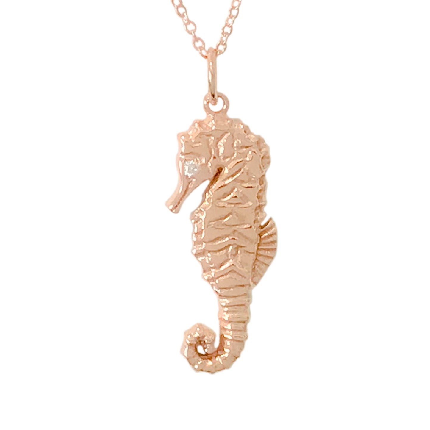 14K Gold Seahorse Pendant Necklace with Diamond Eye, Large Size