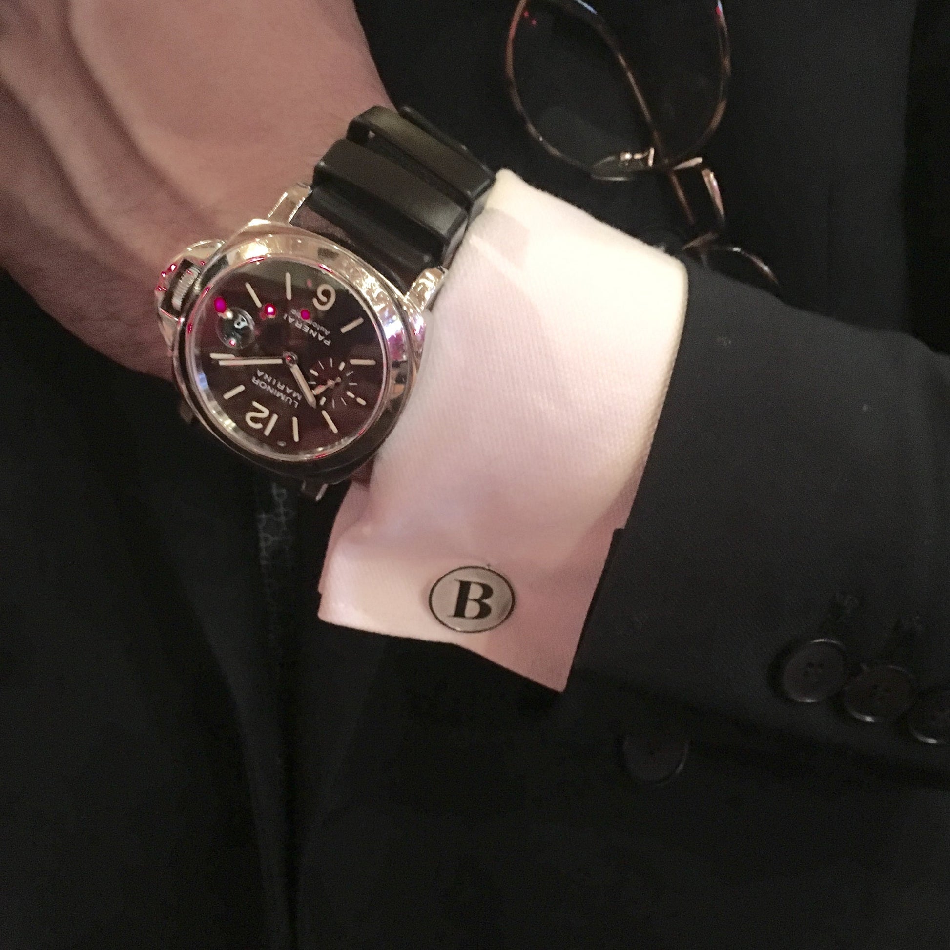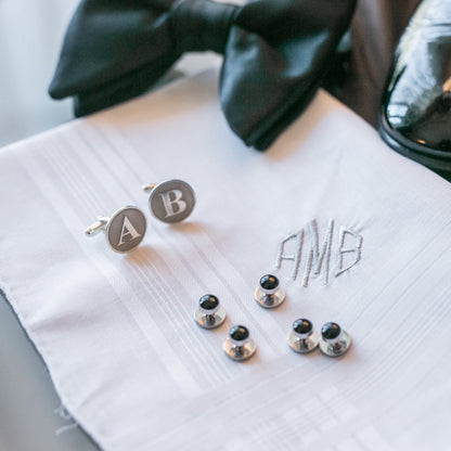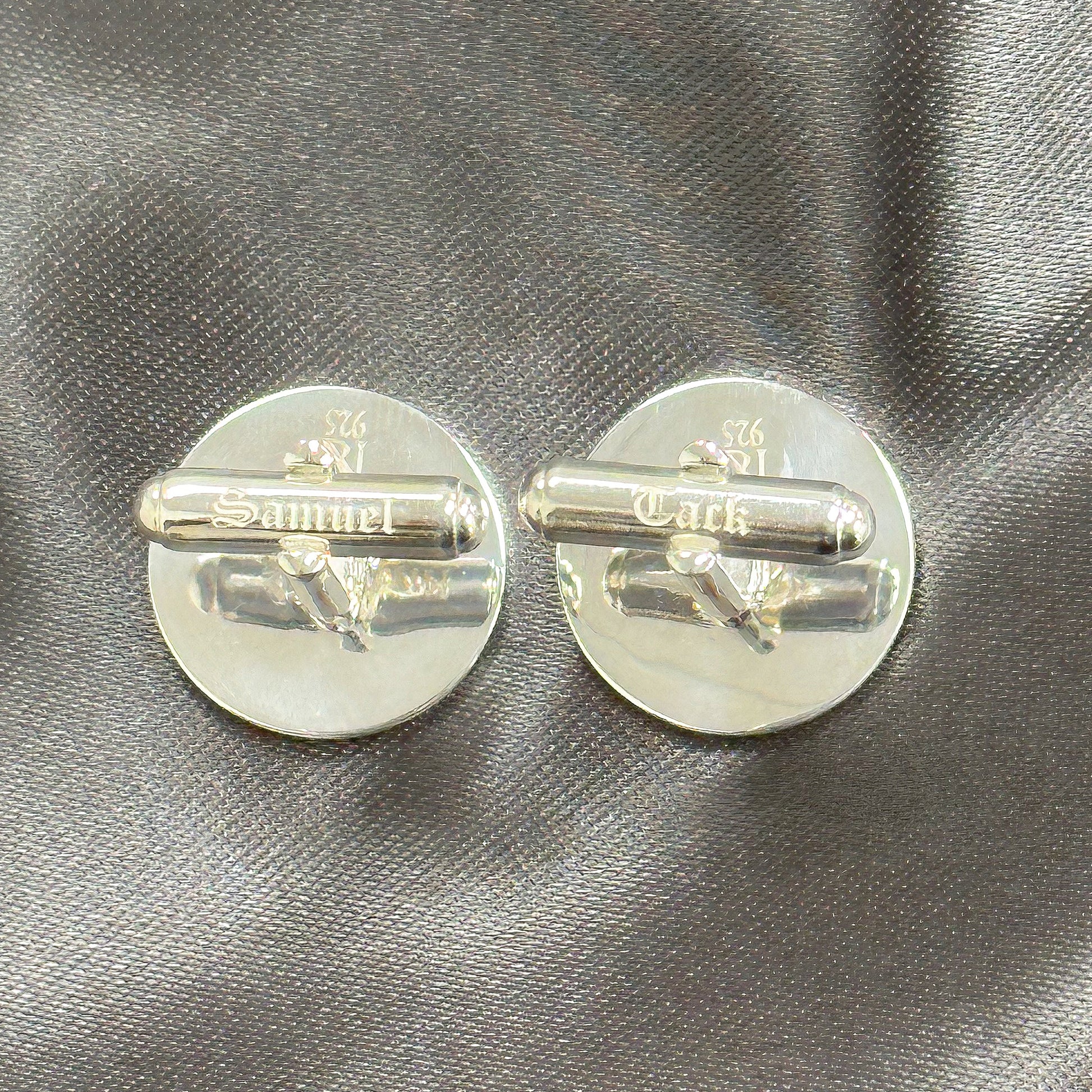 This pair of unique cameo engraved personalized cufflinks is composed of solid Argentium sterling silver and finished with a sterling silver Bullet Back closure.  Behind each letter will also be engraved a name or word of your choice on the bullet back portion of the closure for that extra personalized touch.